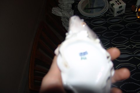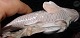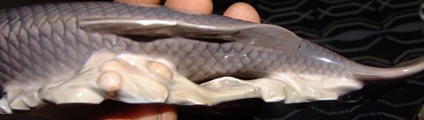 Royal Copenhagen Art Nouveau Karpe Fisk på tang og muslinger No 562. Måler 22,5cm og har skader.