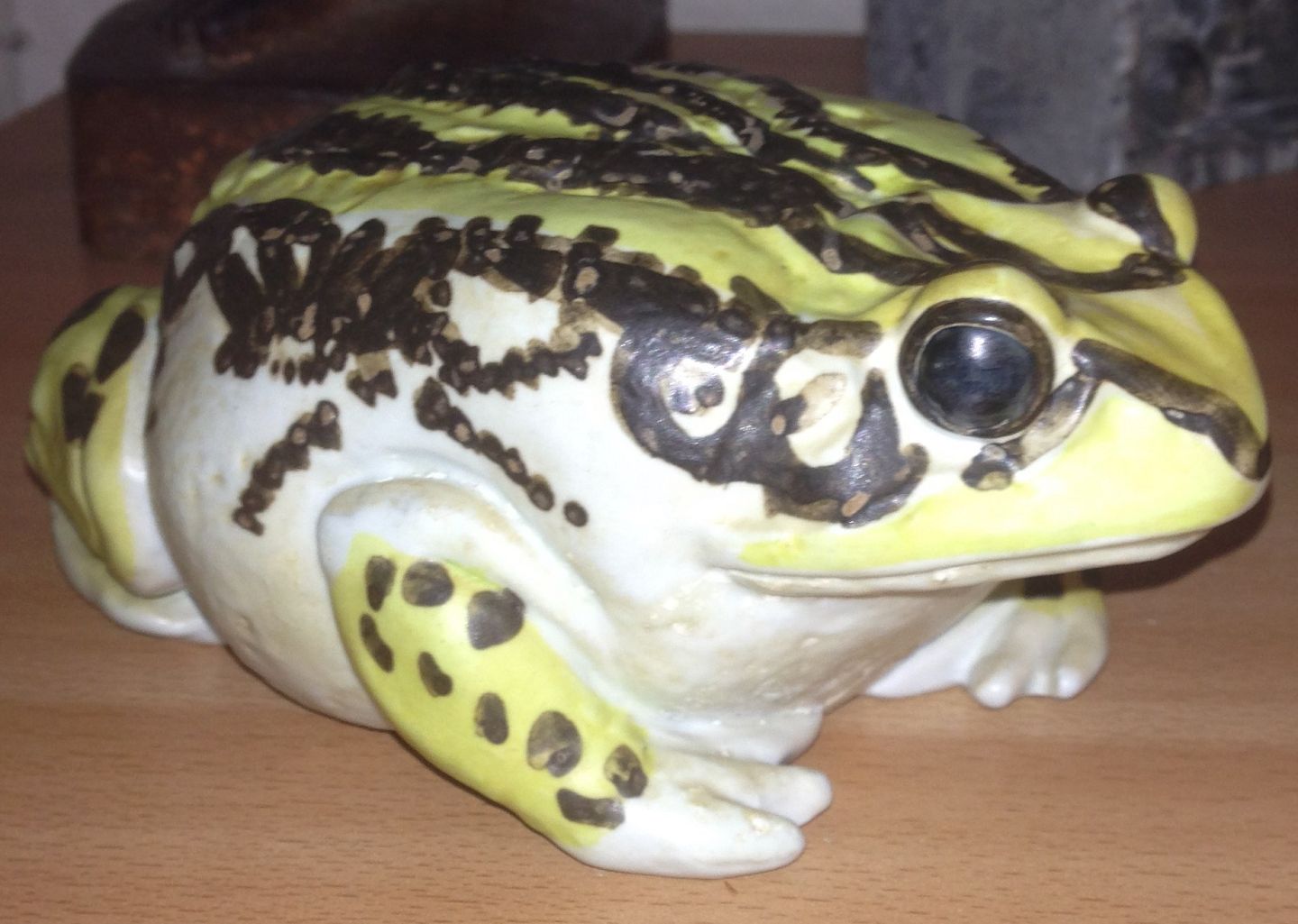 Royal Copenhagen Fajance Figur Skrubtudse No. 494/3443. Designet af Jeanne Grut. Måler 16 cm lang og 5 cm høj og er i perfekt stand.