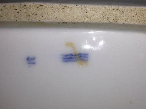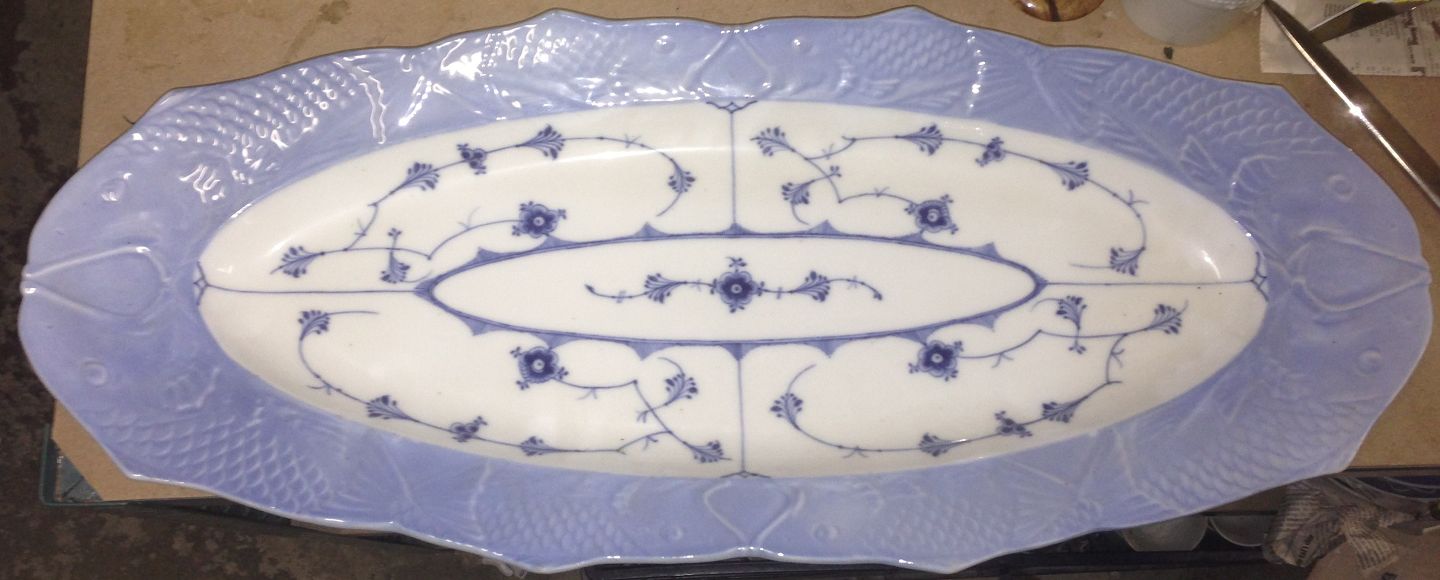Royal Copenhagen Musselmalet Riflet Fiskefad. Måler 61cm x 25cm og er i god stand.