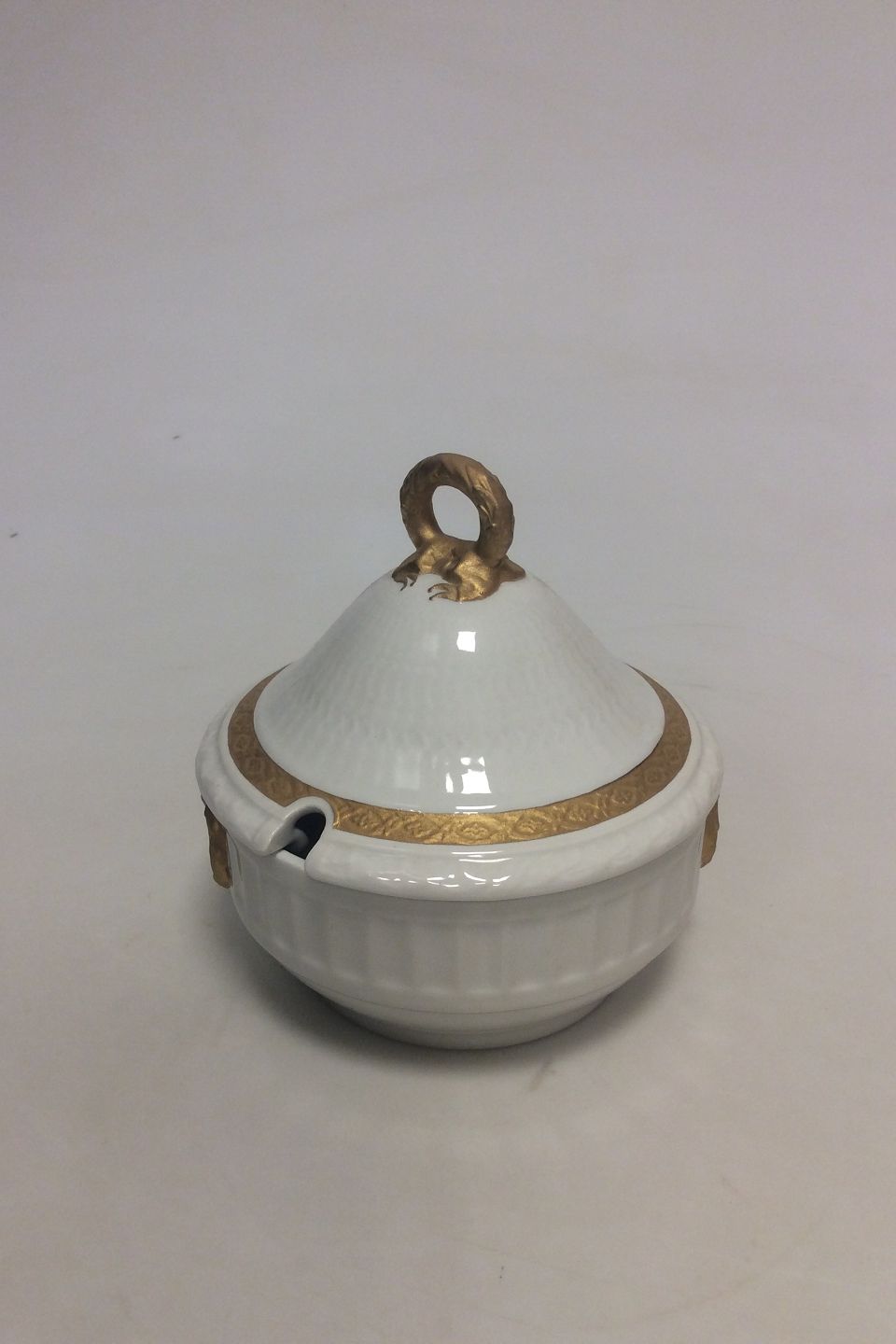 Royal Copenhagen Gold Fan Sauce Bowl with lid No 11506. Measures 13,5cm dia and 14cm high. In perfect condition.