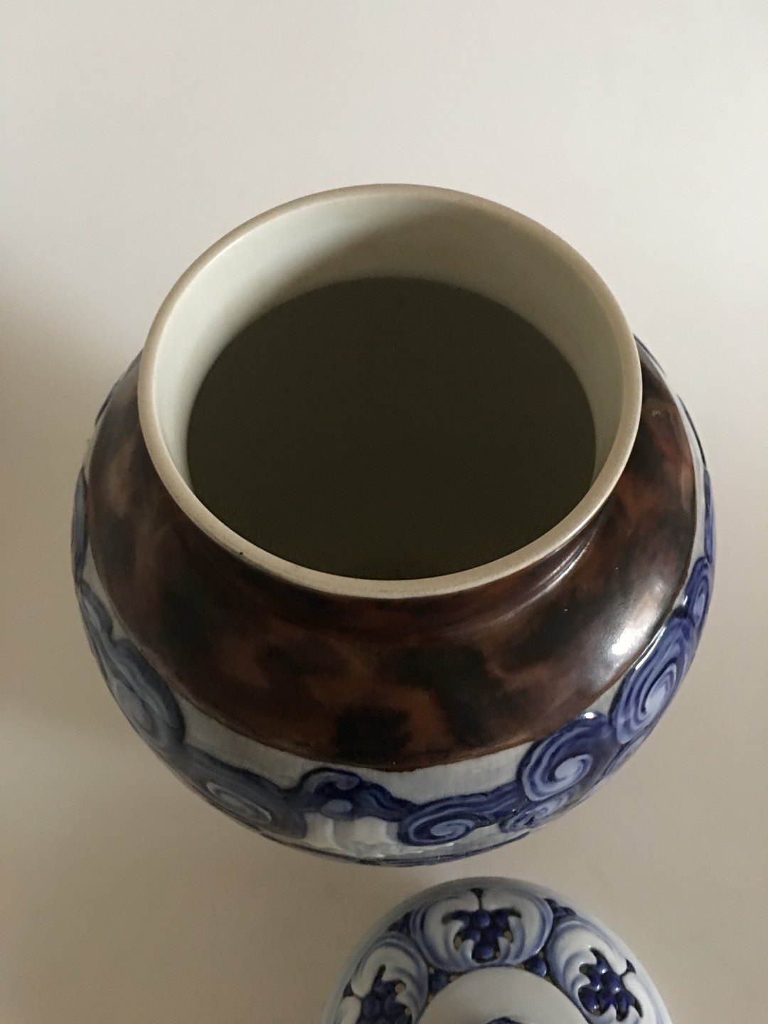 Stor Bing & Grøndahl Art Nouveau Unika låg Vase af Fanny Garde fra 1920. Fantastisk vase med Bindesbøll ornamentik, jern glasur og trompet liljer. Gennembrudt låg. Måler 36,5cm