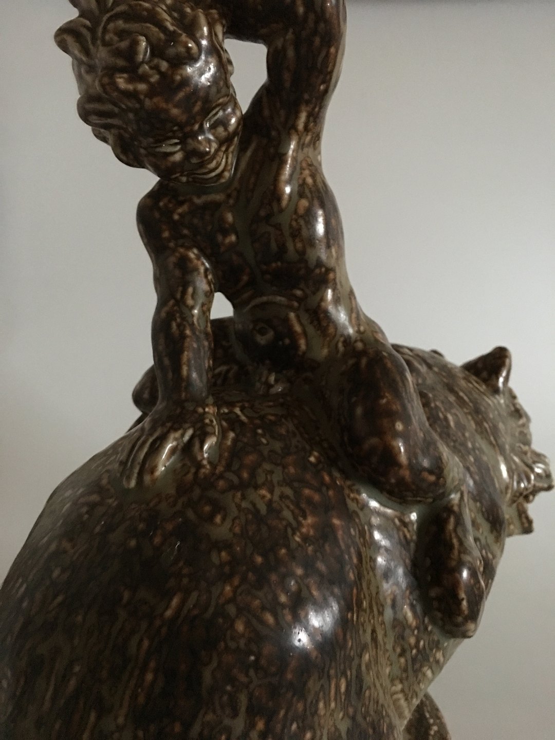 Royal Copenhagen Knud Kyhn Stoneware Figurine of Faun and Bear No. 21233. Measures 43cm and is in perfect condition.