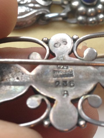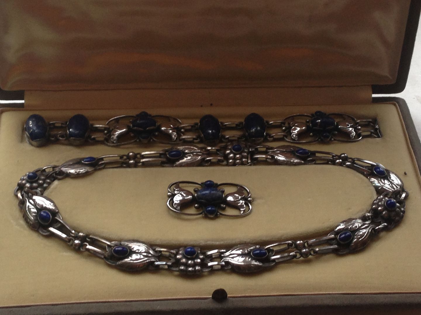 Georg Jensen Sterling Silver Jewelry set. Necklace No 1, Bracelet No 34 and Brooch 236A with Lapis Lazuli. In original box from Georg Jensen Stockholm with dating from 1941. and all the pieces are from 1933-1944. So the items are properly made around 1941.