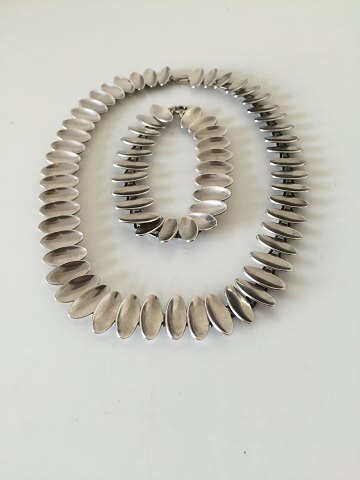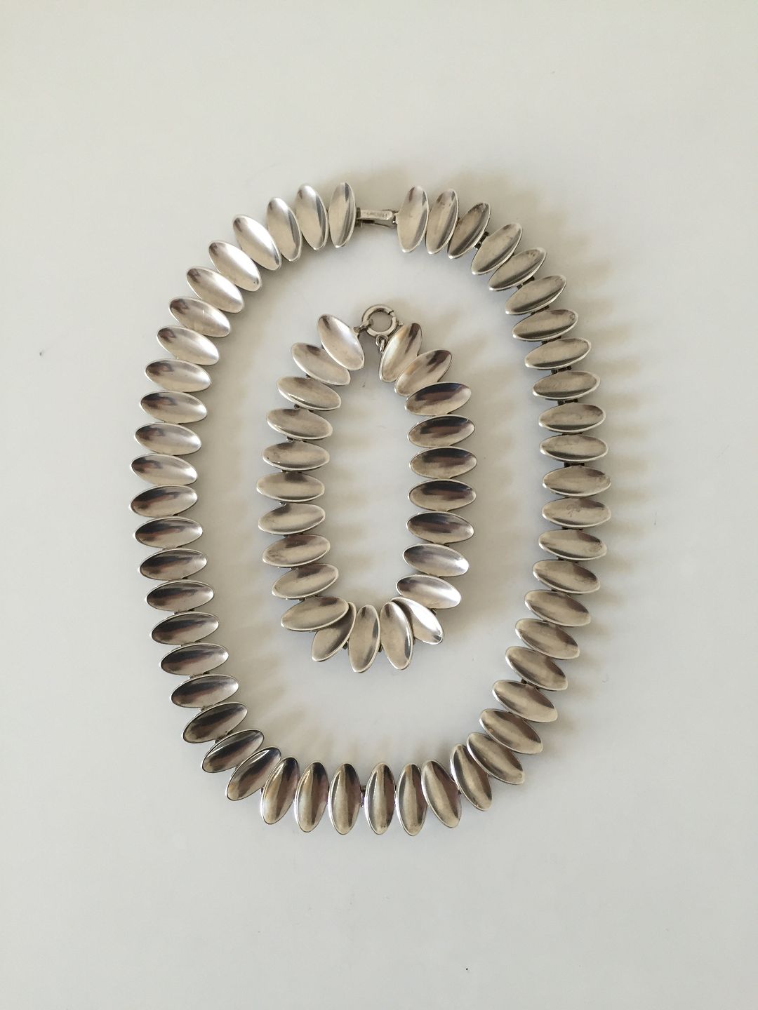 Anton Michelsen Sterling Silver Necklace and Bracelet designed in Nanna Ditzel Style. Measures 19 cm / 7 31/64" and 38 cm / 14 61/64". Bracelet weighs 22.7 g / 0.79 oz., necklace weighs 50.3 g / 1.77 oz.Marked M, Sterling Denmark on the necklace. The bracelet has had the claps replaced, so that is unmarked.