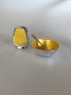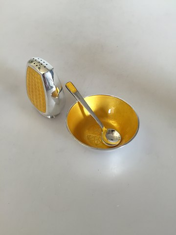 Anton Michelsen Salt & Pebersæt i Sterling Sølv med gul emalje. Samlet vægt 48 g. Peberbøsse måler 5 cm i højden. Saltskålens diameter måler 5 cm. Fremstår i fin stand.