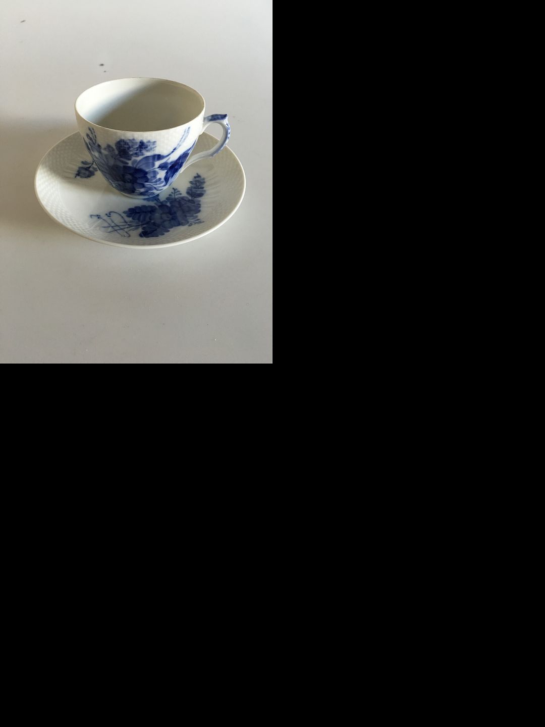Royal Copenhagen Blå Blomst Svejfet kaffekop og Underkop No 1870. Måler 8 cm x 6.5 cm