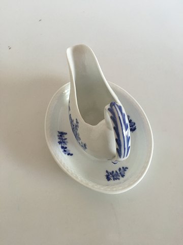 Royal Copenhagen Blå Blomst Flettet Saucekande med Løst Underfad No 8069. Måler 14.5 x 19 cm (5 45/64 x 7 31/64 in). Underfad 23 cm (9 1/16 in). Bemærk at Saucekanden har et lille skår på sin fod.