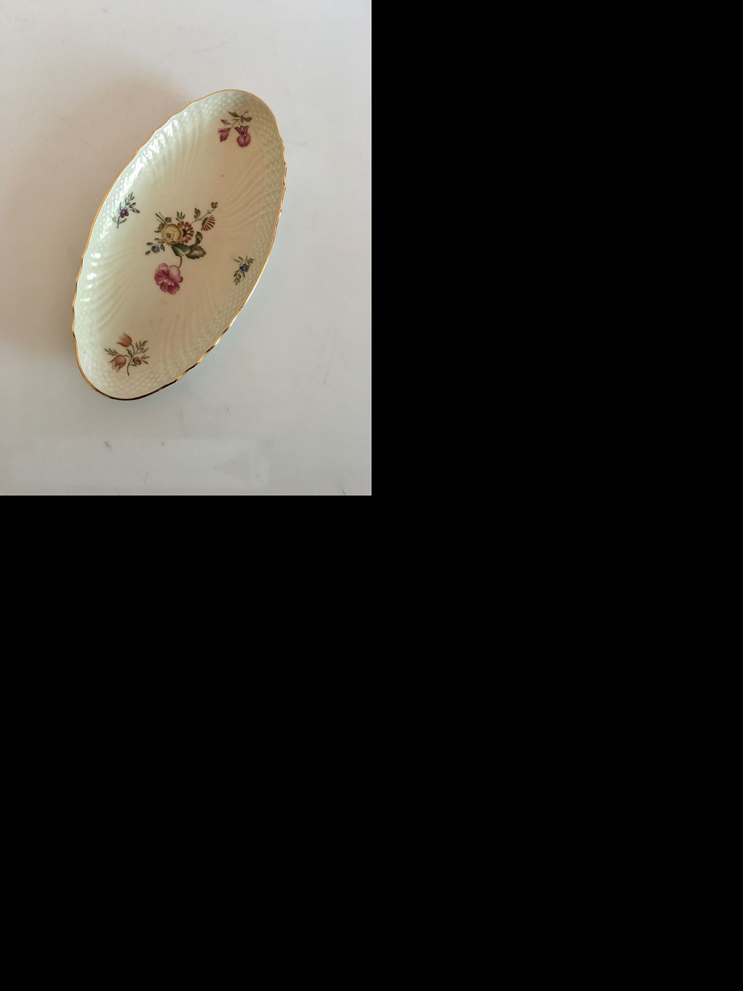 Royal Copenhagen Frijsenborg Oval Asiette No. 1689. Måler 12.5 cm x 24 cm. Cremefarvet stel med blomster motiver opkaldt efter Frijsenborg Gods.