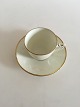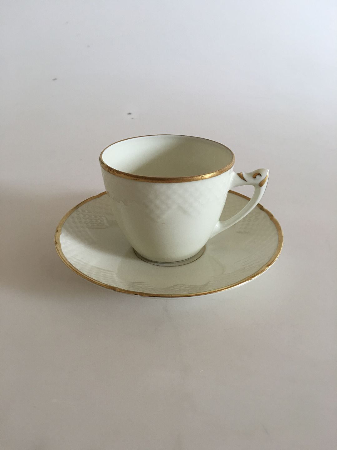 Bing & Grondahl Aakjaer Coffee Cup and Saucer No 102. Creme with gold border. Cup measures 6.5 x 7.5 cm. In good condition.