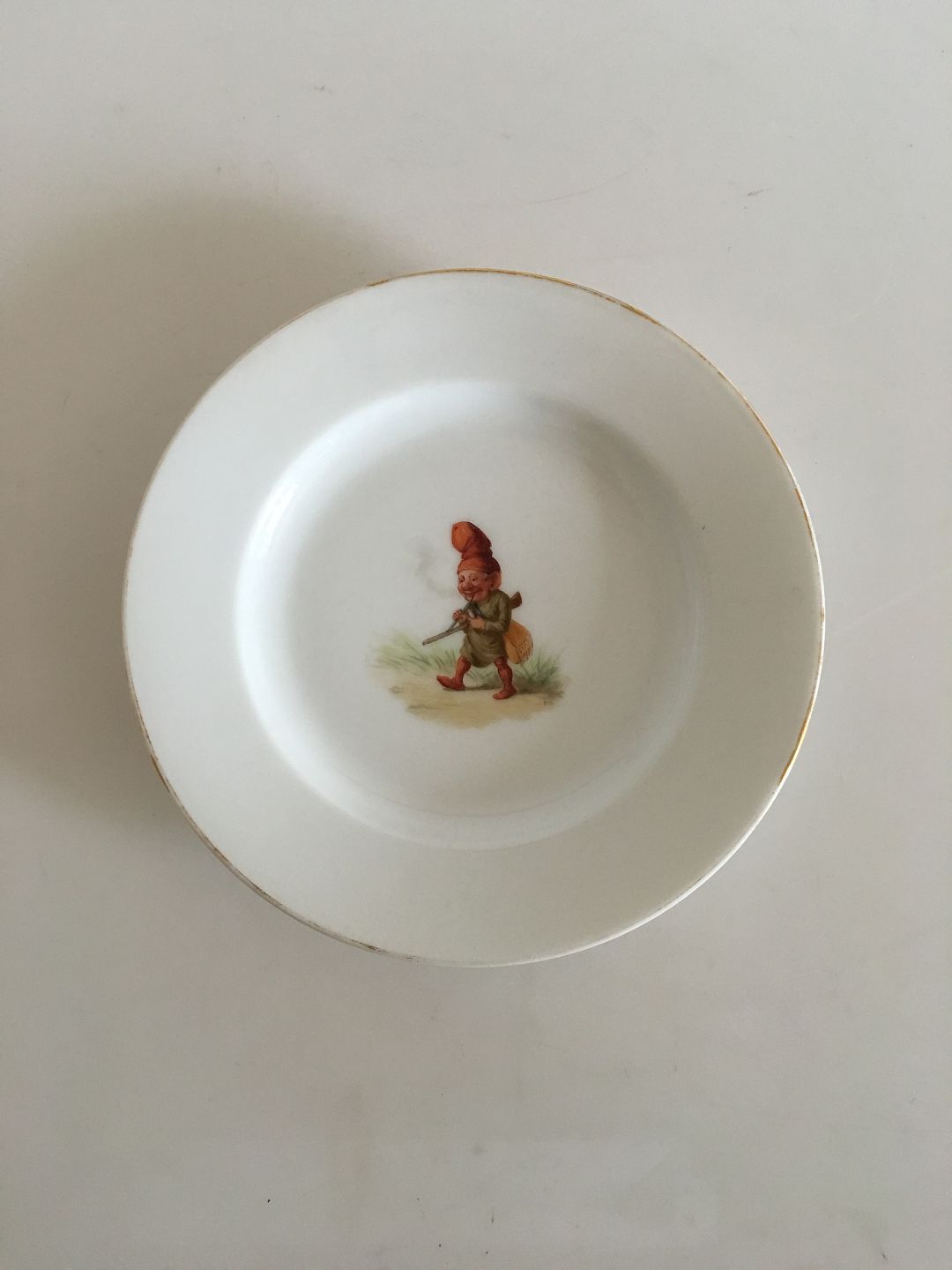5 Tallerken. 20.5 cm. Nisse med fisk. Guldet på kanten er næsten slidt af. Ingen skår.