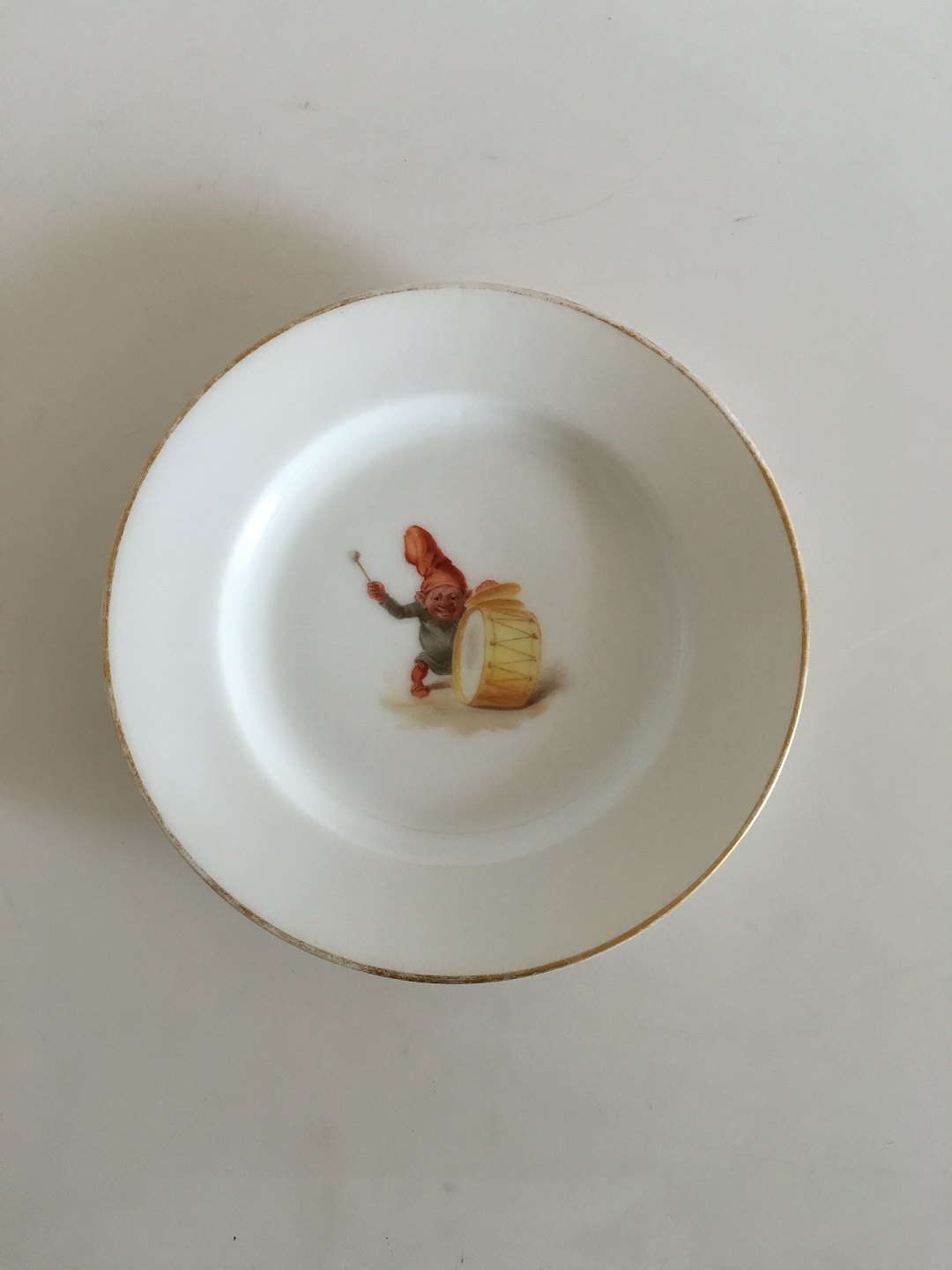 4 Tallerken 20.5 cm. Nisse med Tromme. Guldet på kanten er en del slidt. Ingen skår.