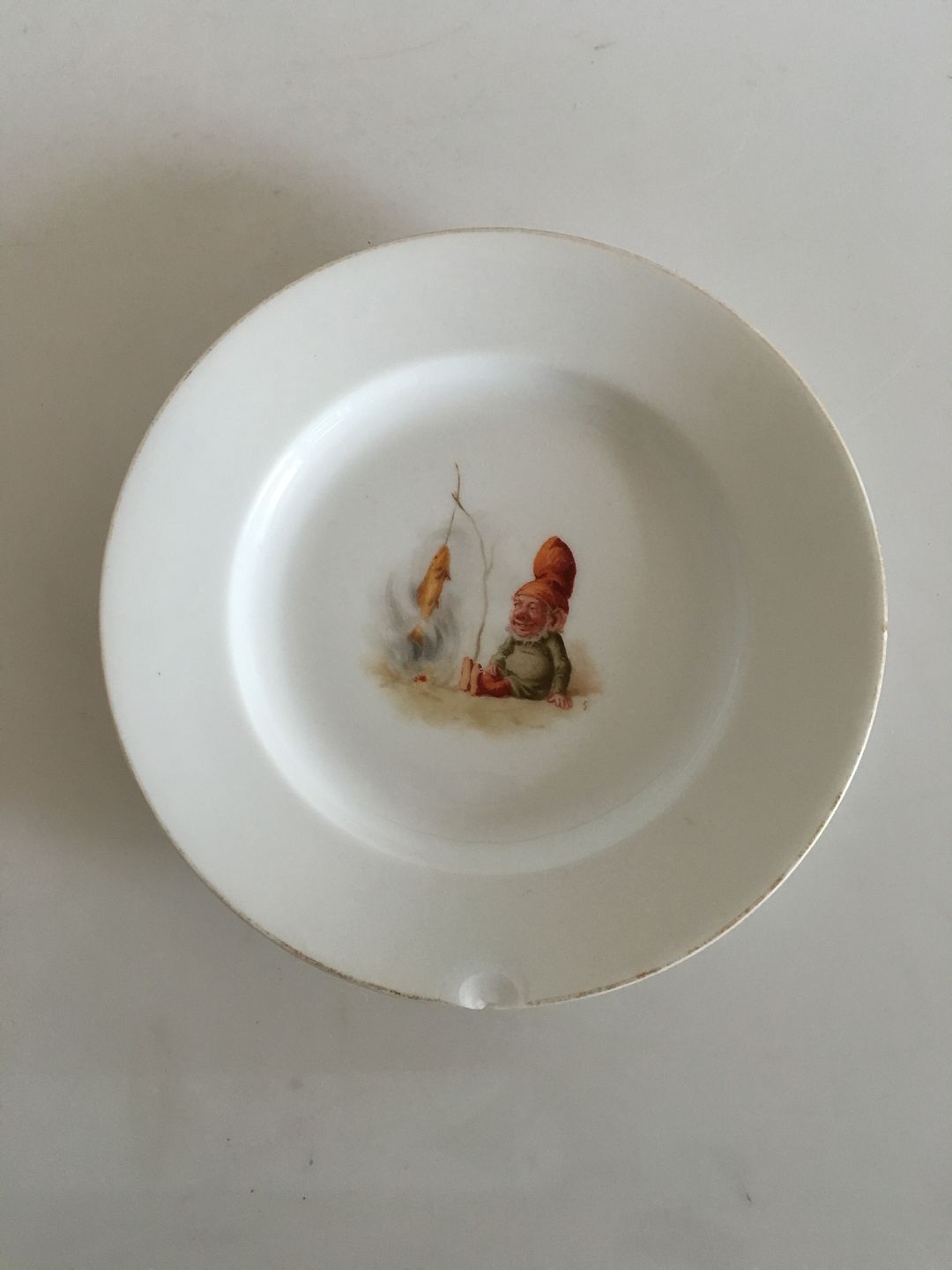 2. Tallerken 20.5 cm. Nisse med fiskestang. Guldet er en del slidt. Tallerkenen har et skår langs kanten.