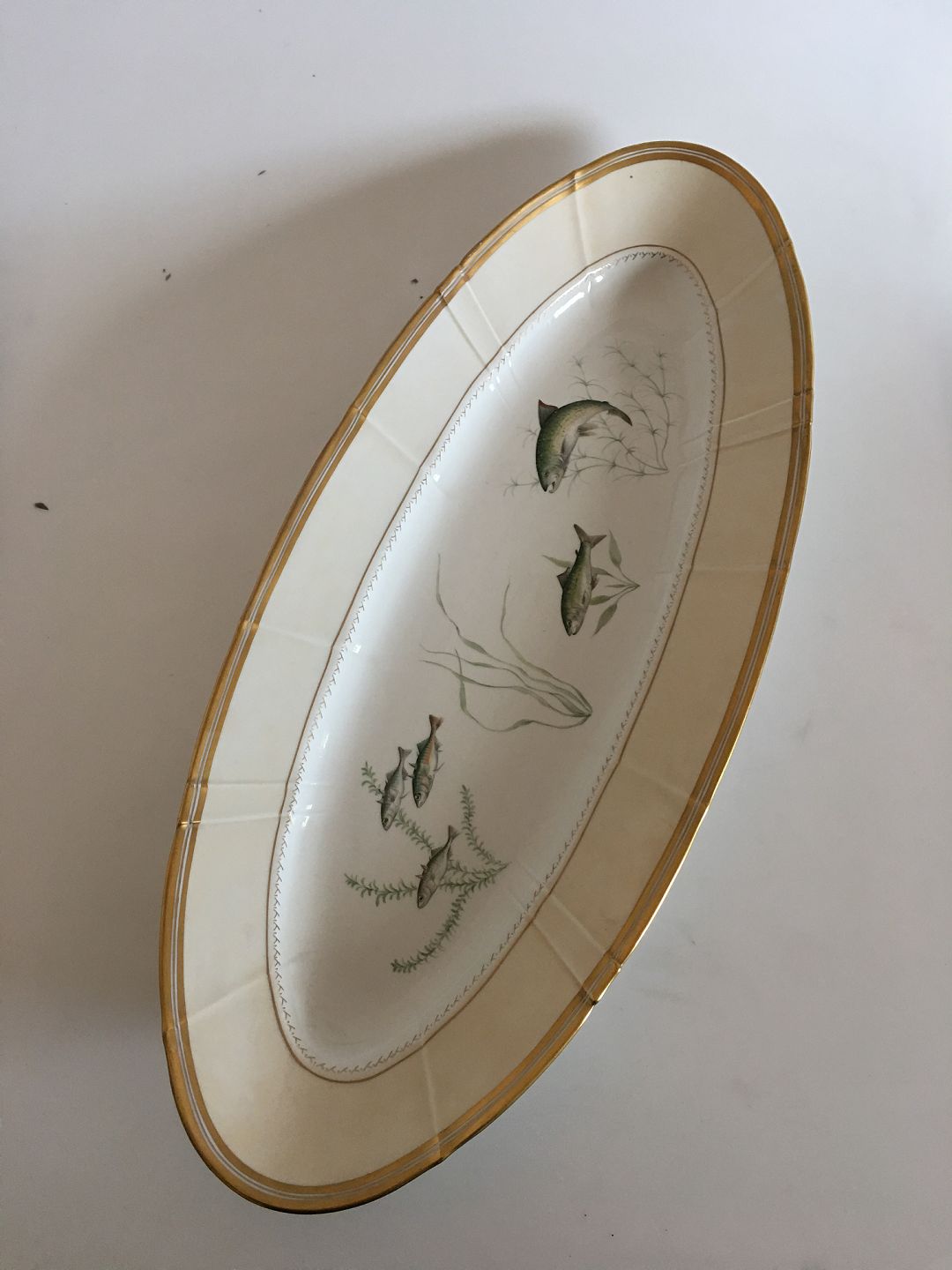 Bing & Grøndahl Dumas Fiskefad No 13A med Laks og Hundestejle . 68.5 cm L. I meget fin stand.