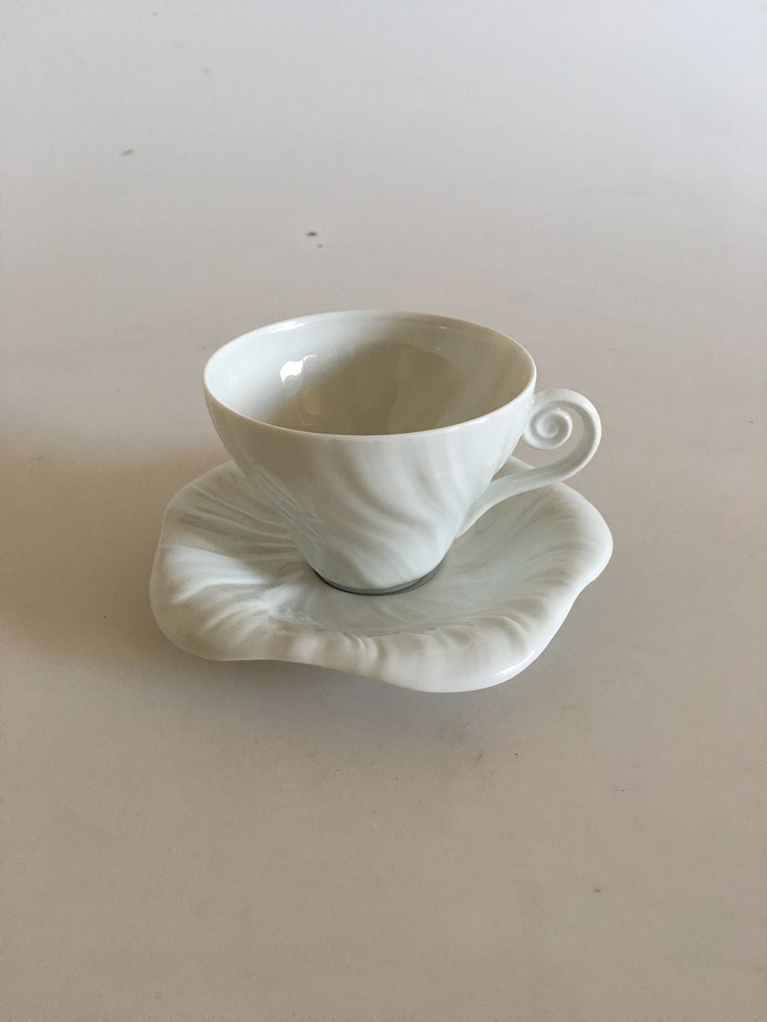 Royal Copenhagen White Triton Mocca Cup and Saucer14179(072/073). Cup measures 5.5 cm H (2 11/64"). 7.5 cm dia (2 61/64"). In perfect condition. Designed by Arje Griegst