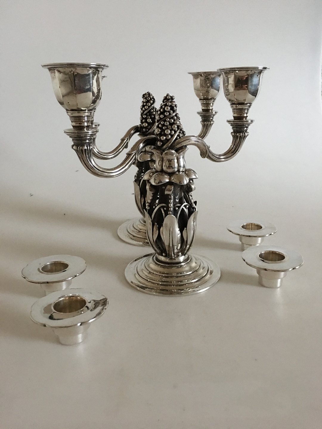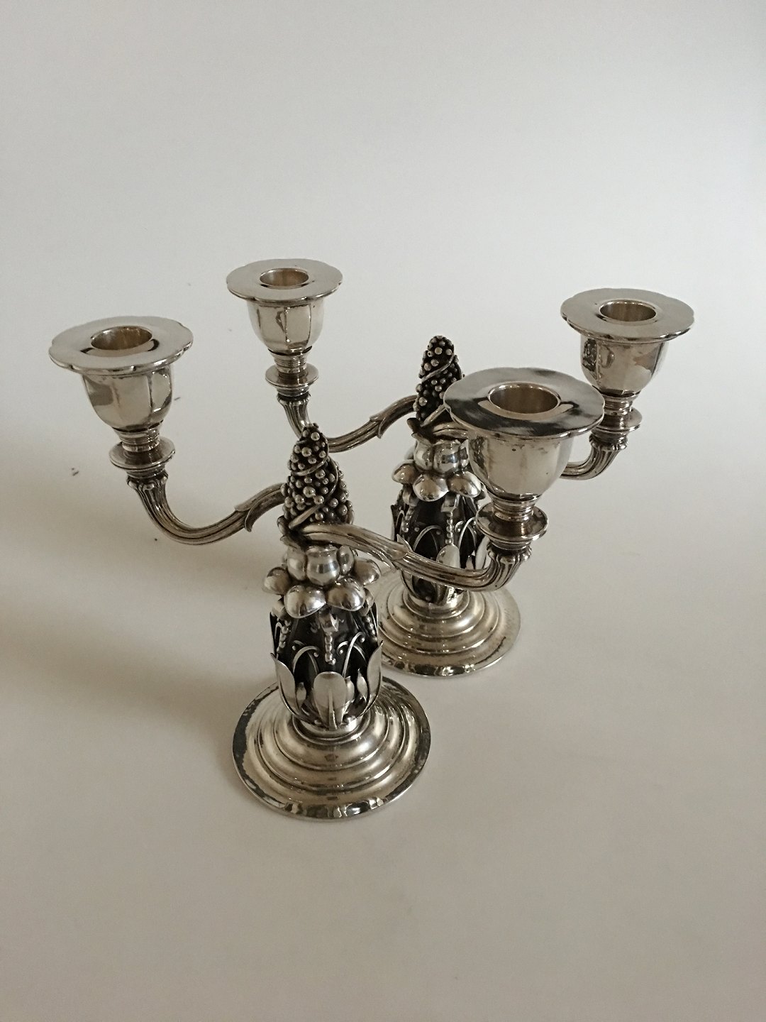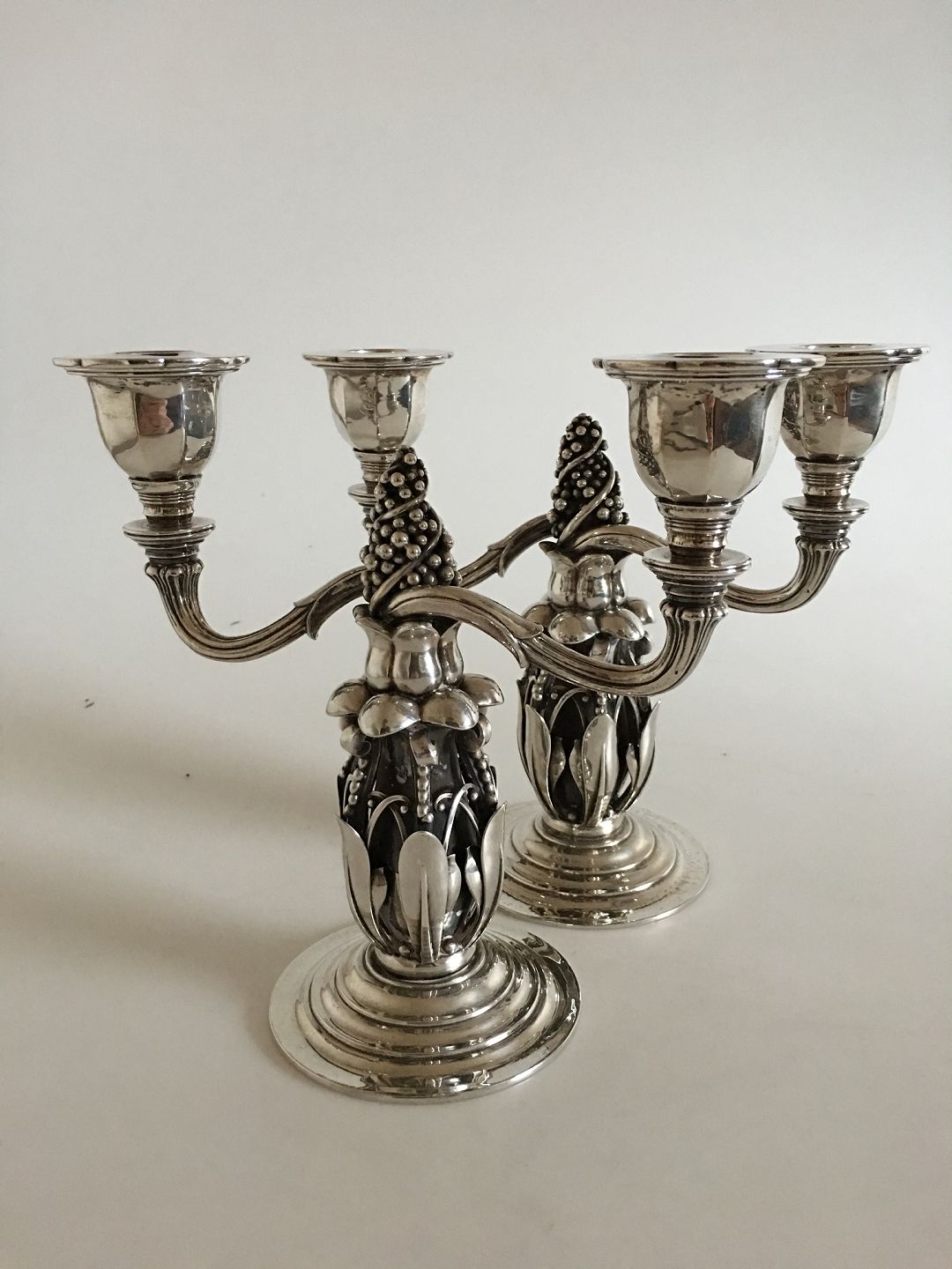 Georg Jensen Sterling Silver Candelabras No 244 with Grape and Leaf Ornament. From 1921 and with old marks. I beautiful condition. With detachable bobeches (candle holders) Measures 21 cm H (8 17/64"). Wingspan 23 cm (9 1/16") Each candelabra weighs 1330 grams / 46.90 oz.