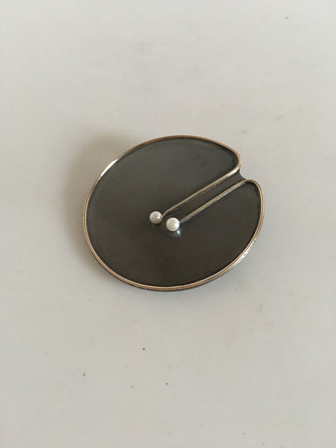 Hans Hansen Brooch in Oxidized Sterling Silver with Pearl and Gilded Rim. Measures 4.7 cm dia / 1 27/32 in. Weighs 18 g / 0.60 oz. In perfect condition.