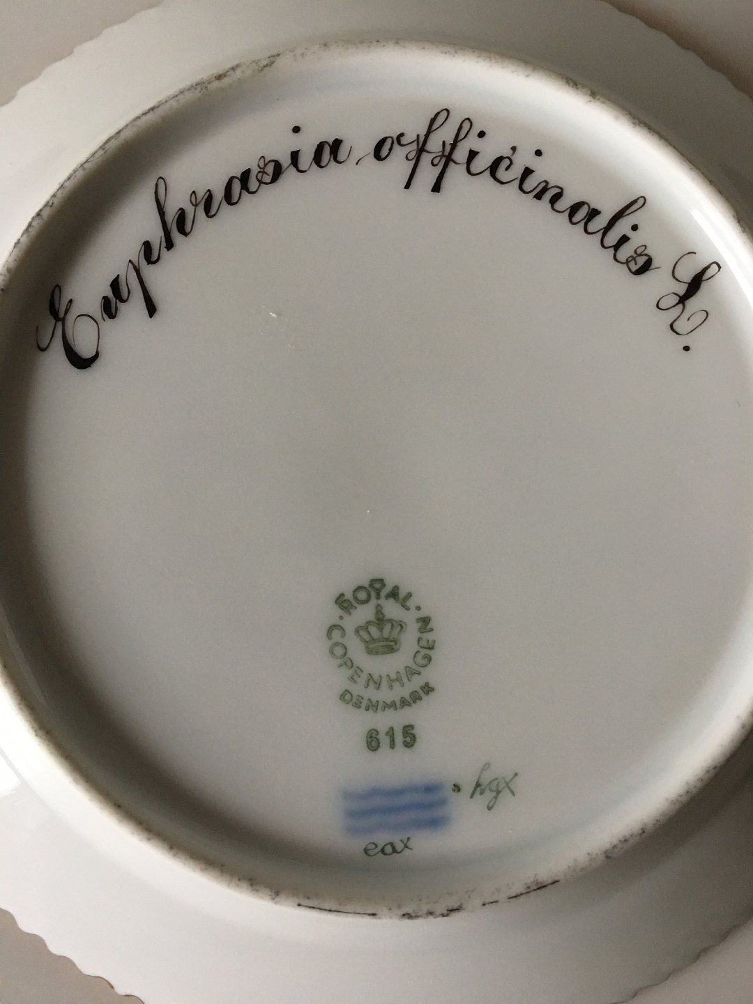 Royal Copenhagen Flora Danica Side Tallerken No 615. Latinsk Navn: Euphrasia Officinalis (Øjentrøst). 14.5 cm Ø. I fin og hel stand.