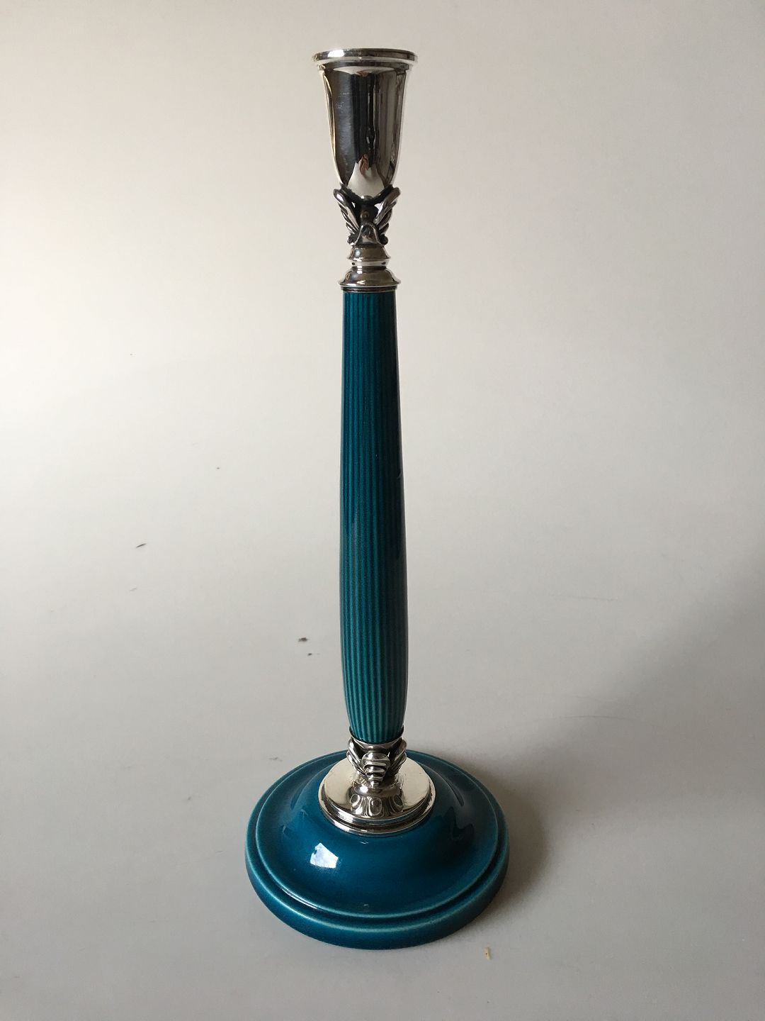 Georg Jensen Candlestick in Sterling Silver and Porcelain No 4001. Design by Harald Nielsen. Porcelain pieces by Bing & Grondahl. Marked Georg Jensen & Wendel. From 1945-1951. 29 cm H. (11 27/64")