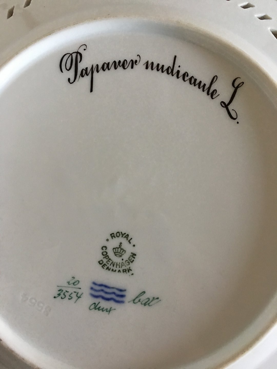 Royal Copenhagen Flora Danica Frokosttallerken No 3554 med gennembrudt kant. Latinsk Navn: Papaver Nudicaule (Sibirisk Valmue). 23 cm. 1. Sort. I perfekt Stand