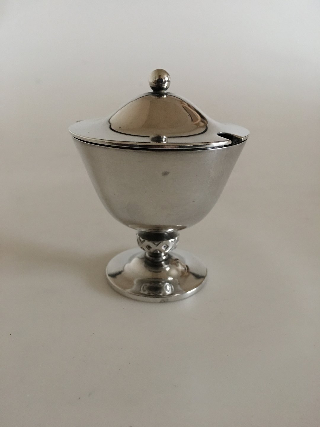 Georg Jensen Sterling Silver Johan Rohde Mayan Mustard Egg No 876 with Blue Enamel. 7 cm H (2 3/4"). 5.5 cm dia (2 11/64"). Weighs 83 grams (2.95 oz). Marked Georg Jensen & Wendel. From 1945-1951.