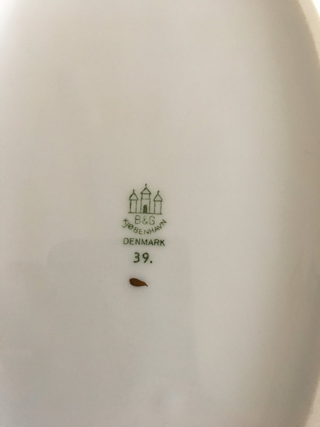 Bing & Grøndahl Tiber Oval Skål No 39. 3.5 cm H. 22.5 cm Ø. Hvid med Lysegrå Bord og Guldkant. I fin stand.