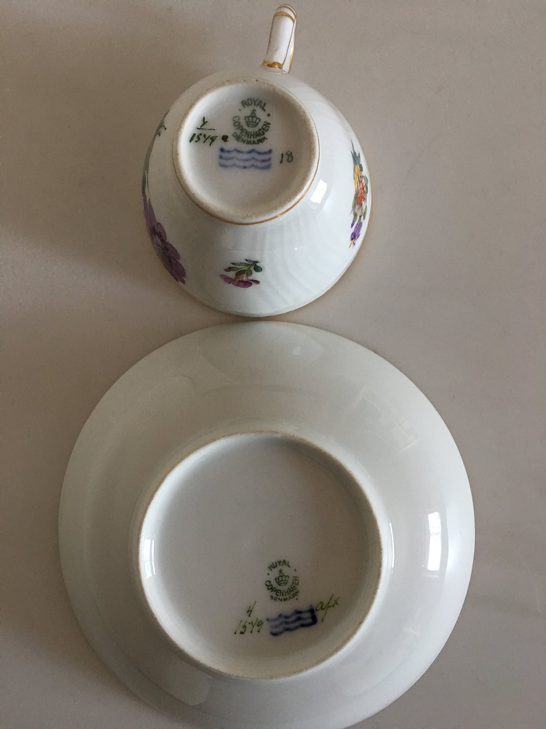 Royal Copenhagen Full Saxon Flower Coffee Cup and Deep Saucer No. 1549. Cup measures 5.5 cm H (2 11/64 in.) 7.3 cm dia (2 7/8 in.) Saucer measures 13.5 cm dia ( 5 5/16 in.) 1st Quality.
