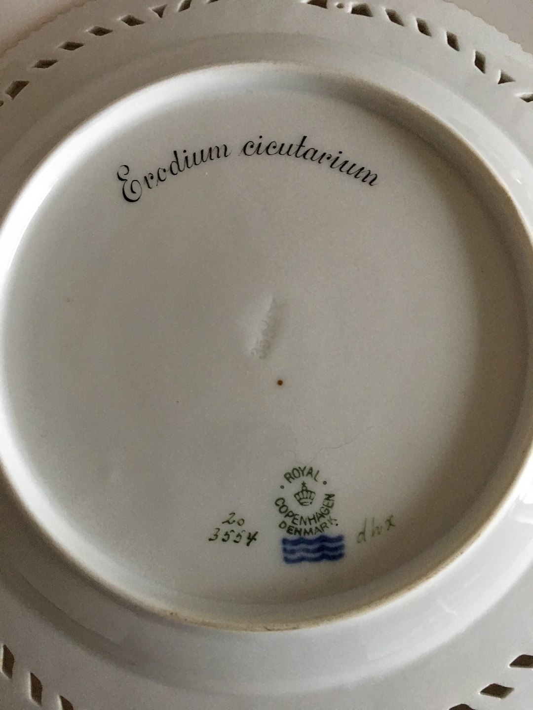Royal Copenhagen Flora Danica Pierced Luncheon Plate No 20/3554. 23 cm (9 1/16"). Lantin Name: Erodium Cicutarium. With old mark from 1923-1934.