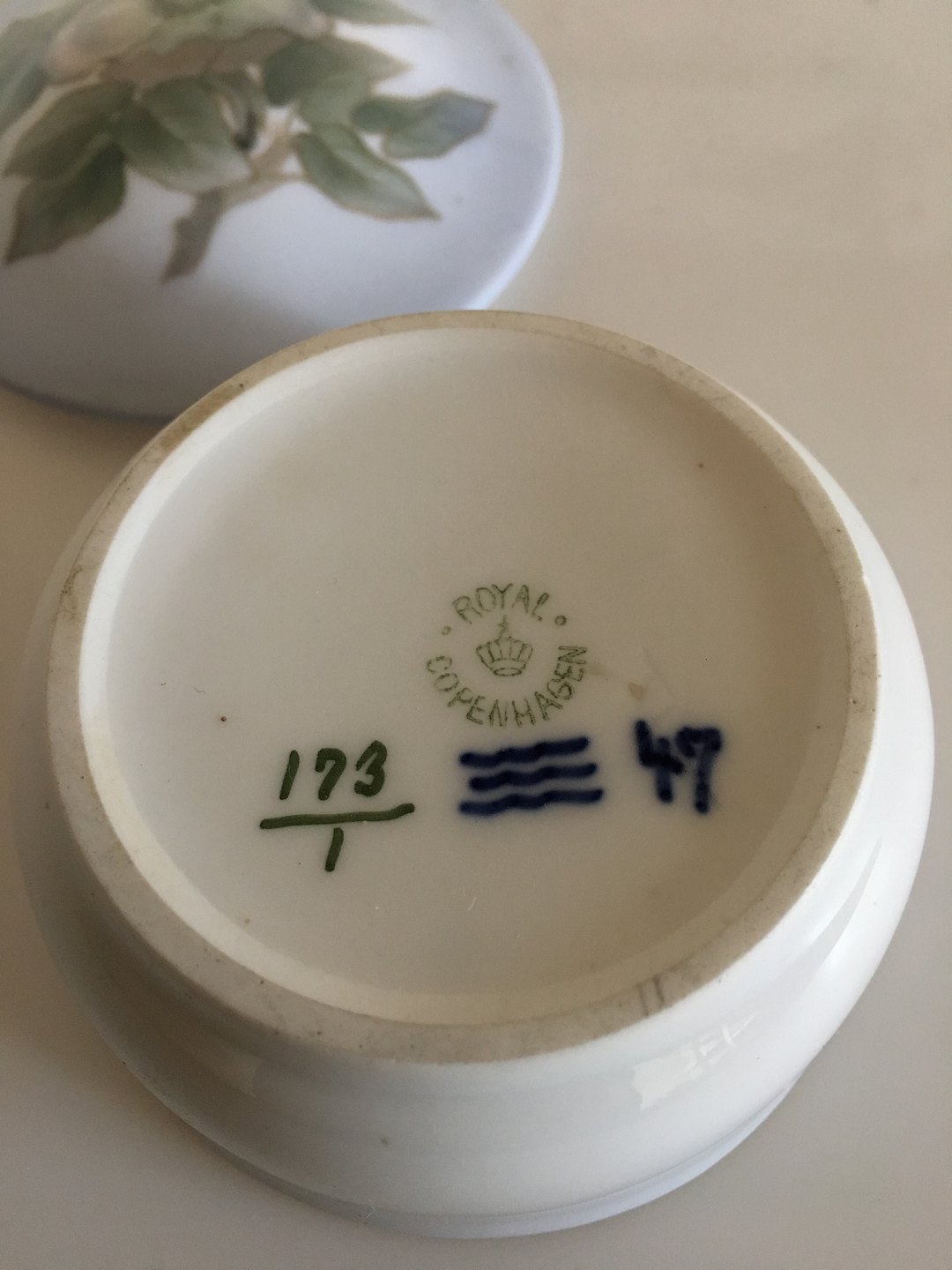 Royal Copenhagen Art Nouveau Lidded Bowl with Flower Motif No 173/1. 5 cm H (1 31/32"). 9 cm dia (3 35/64"). 1st Quality. In good whole condition