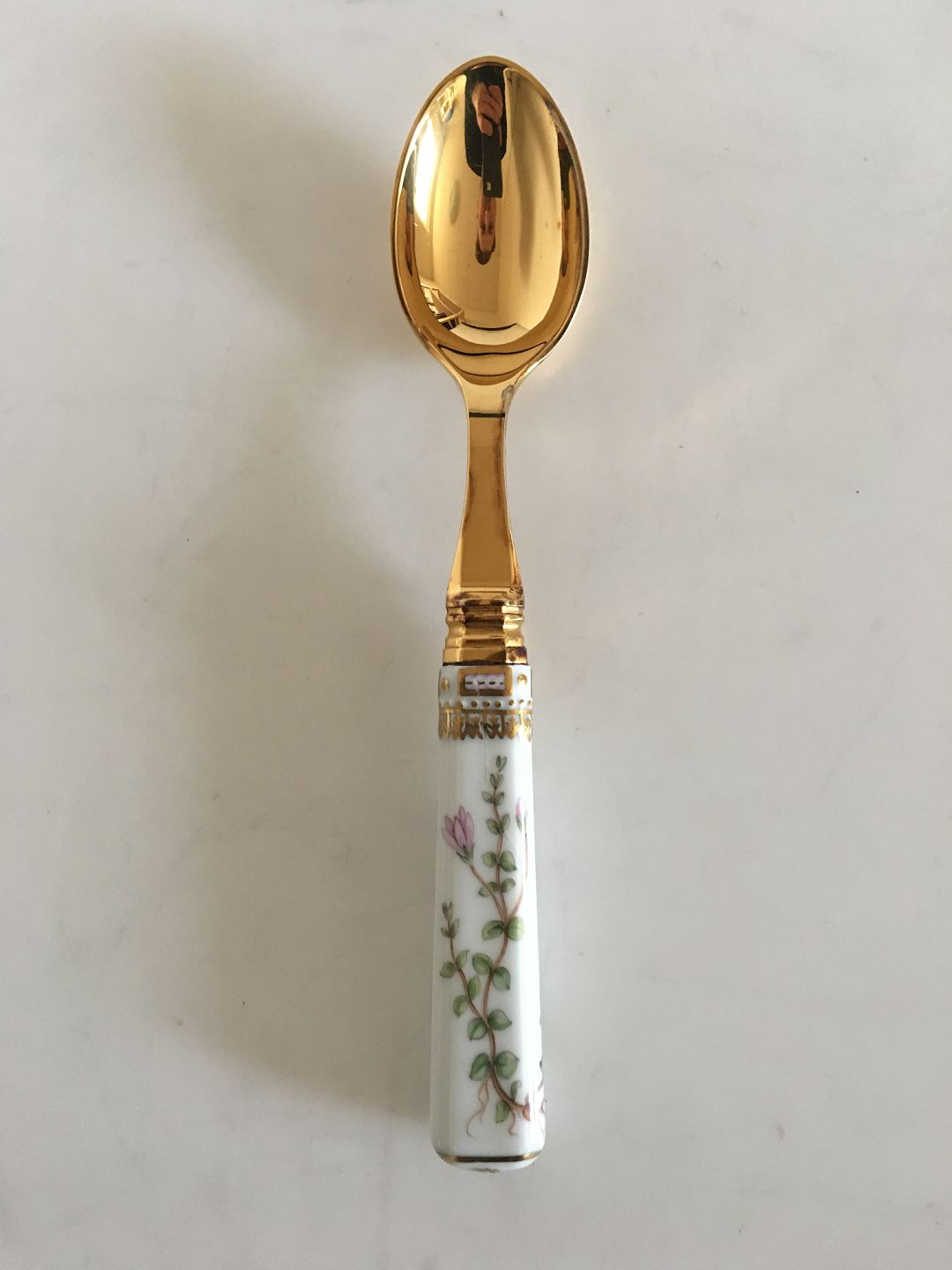 Royal Copenhagen Flora Danica Ske 19 cm L. I porcelæn med top i forgyldt sterling sølv produceret af Georg Jensen. Skeen har en lille hårevne (se billede).