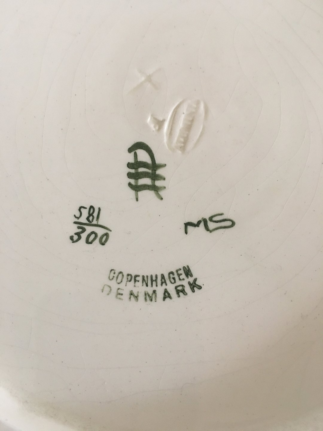 Aluminia Earthenware Round Dish / Bowl No 581/300 with Bird Motif. Signed MS. Measures 45.5 cm dia (17 29/32"). In great condition without chips, reparations etc.