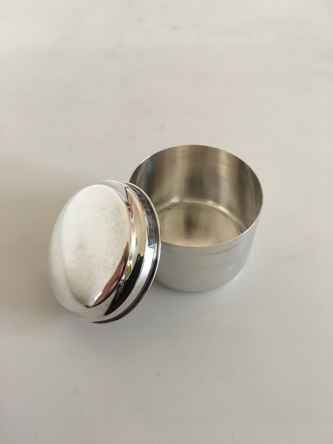 Nice little round pillbox in Silver. 3.5 cm dia (1 3/8"). 2.8 cm H (1 7/64"). In nice condition.