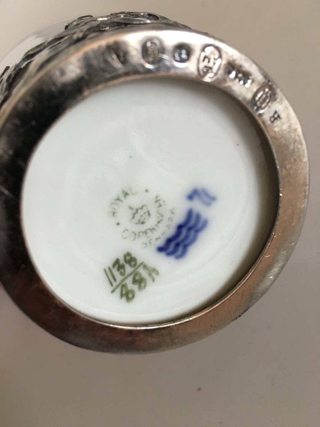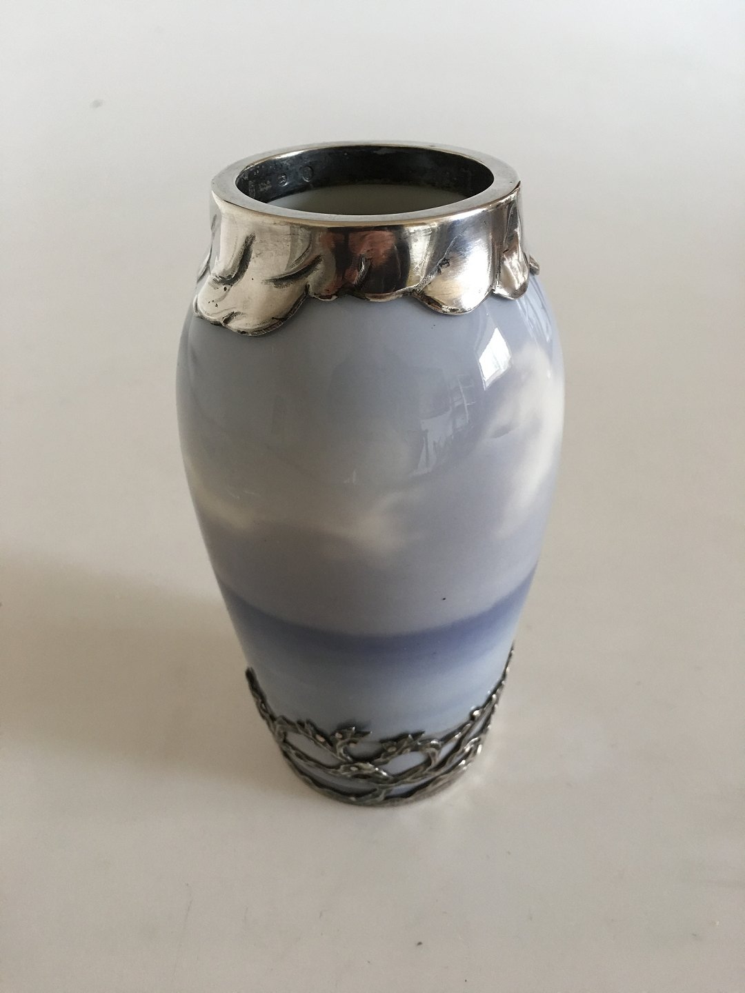 Royal Copenhagen Art Nouveau Vase No. 1138/88A with Seagull and Sea Motif. Anton Michelsen Sterling Silver Top and Bottom Piece. 14 cm H. 1st Quality. In nice whole condition.