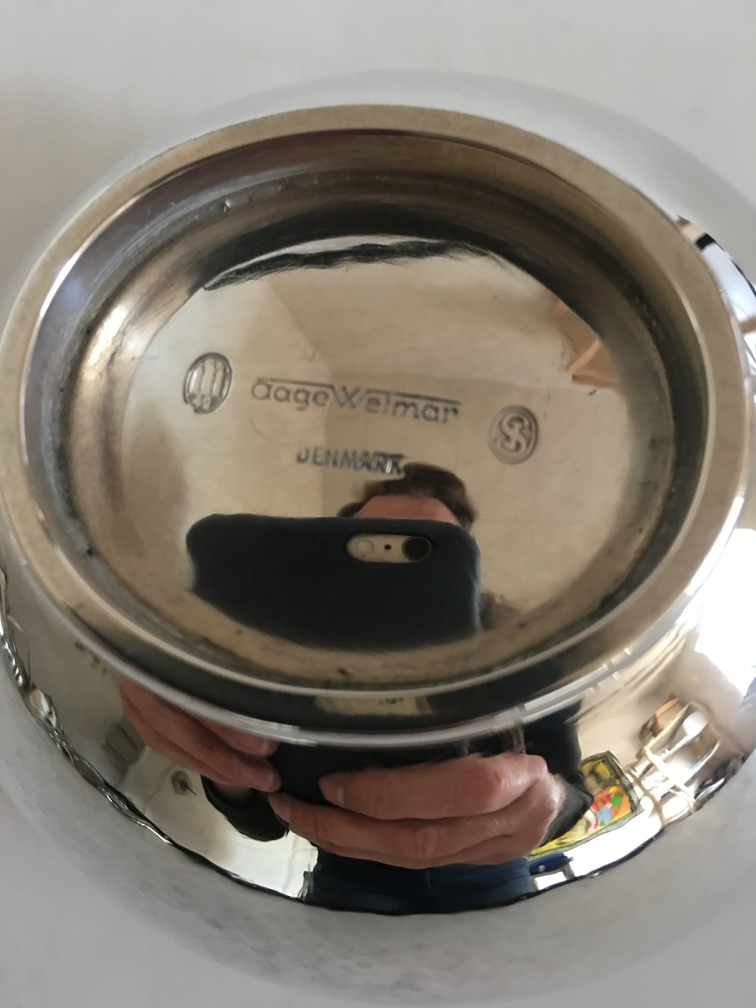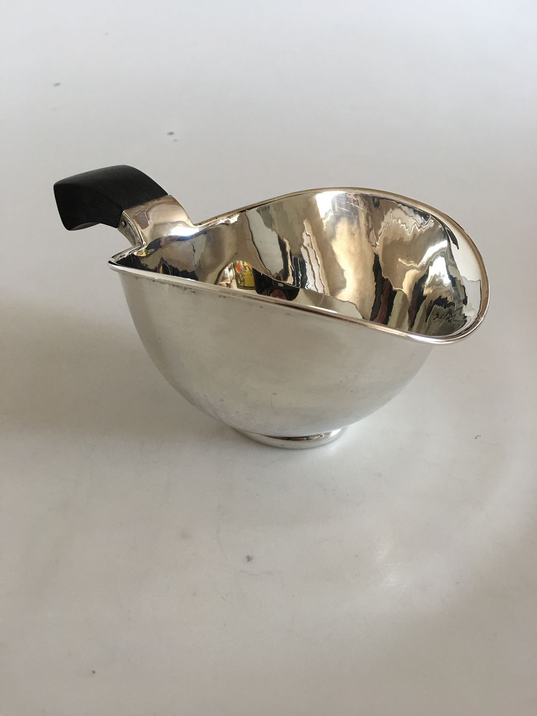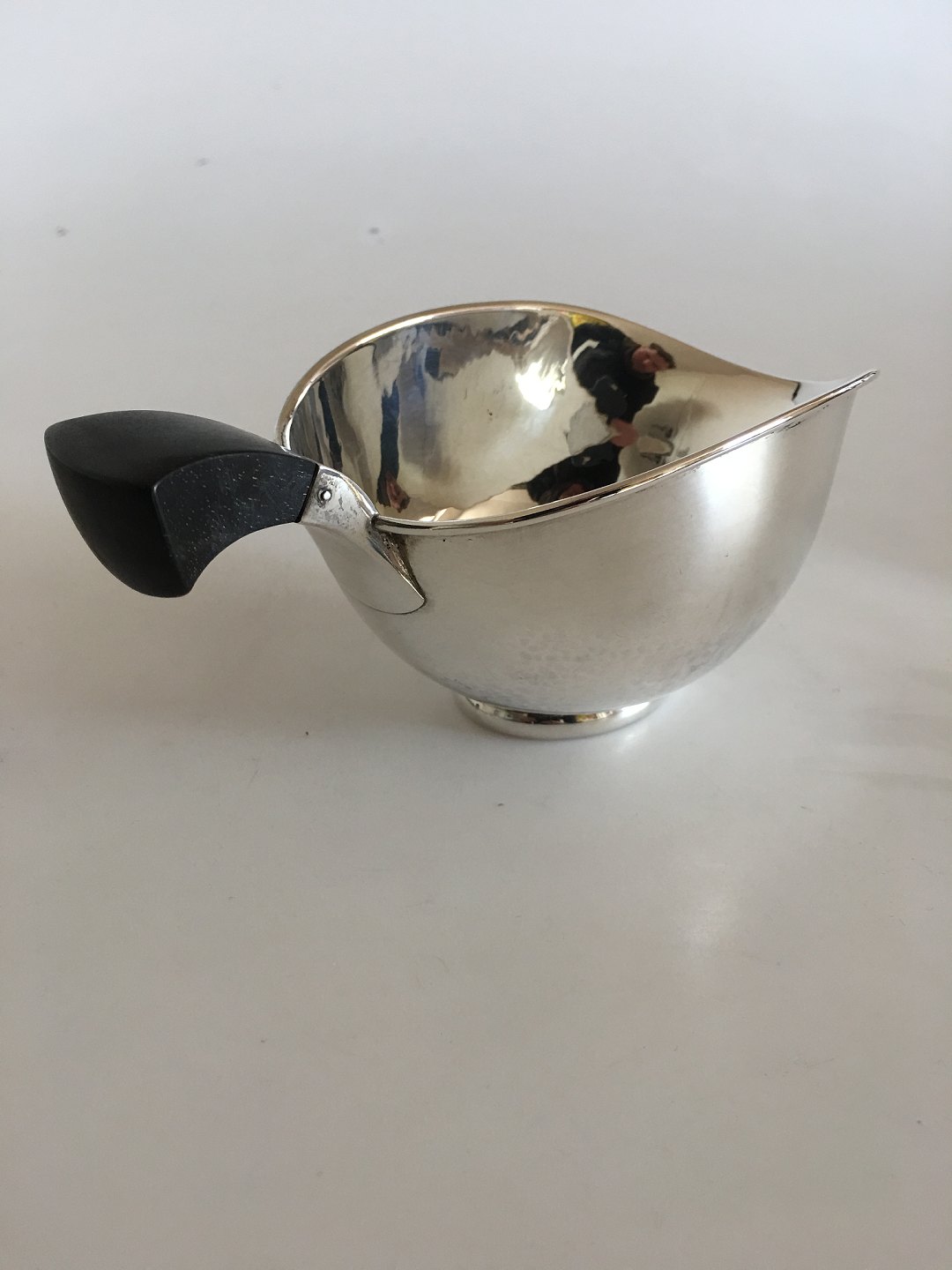 Aage Weimar Lille Saucekande i Sølv med Træhank. 7 cm H. 11.5 cm Ø. Vejer 191 gram. I pæn stand.