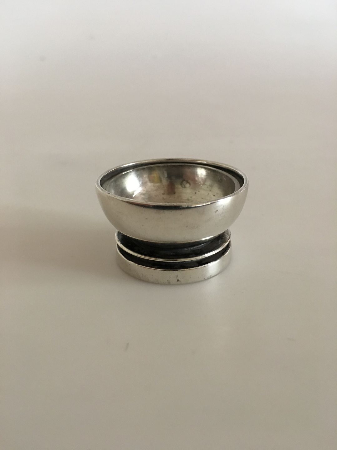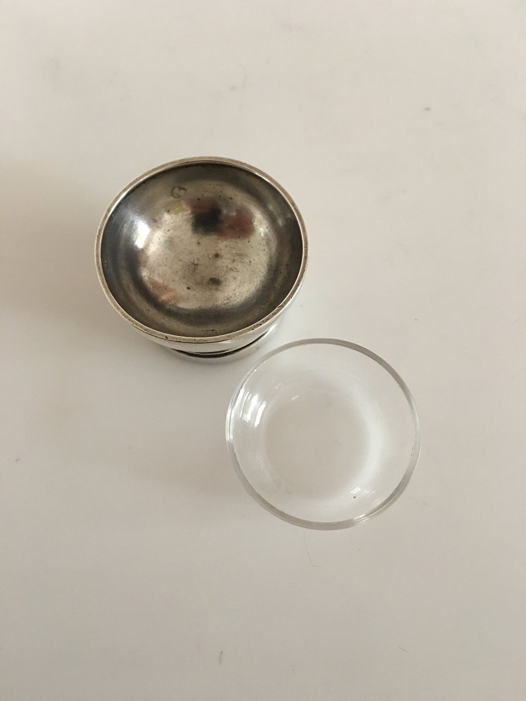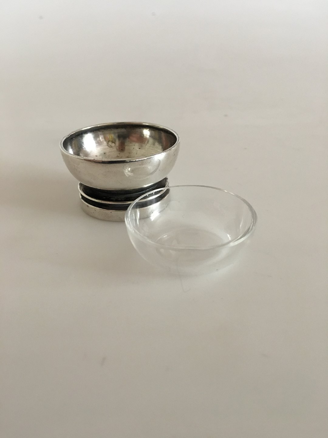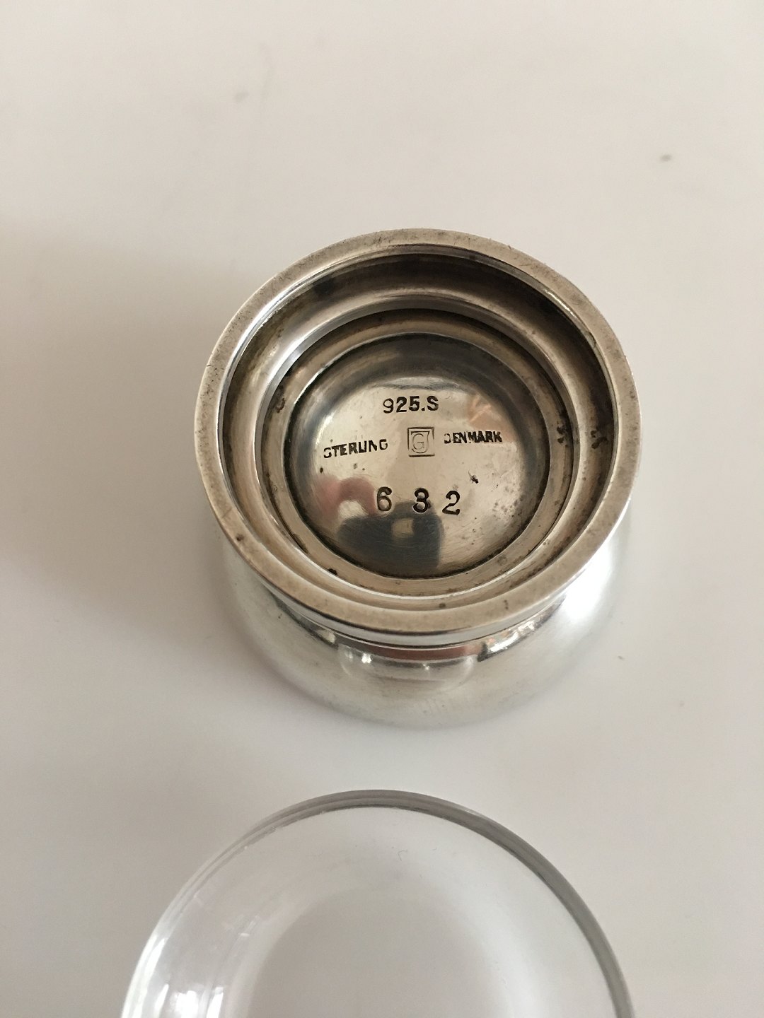 Georg Jensen Sterling Pyramide Saltkar No 632 med Glas Indsats. Designet af Harald Nielsen. I pæn stand og med intakt glas. Ca 2.3 cm H. 4 cm Ø. Vejer ca 37 gram.