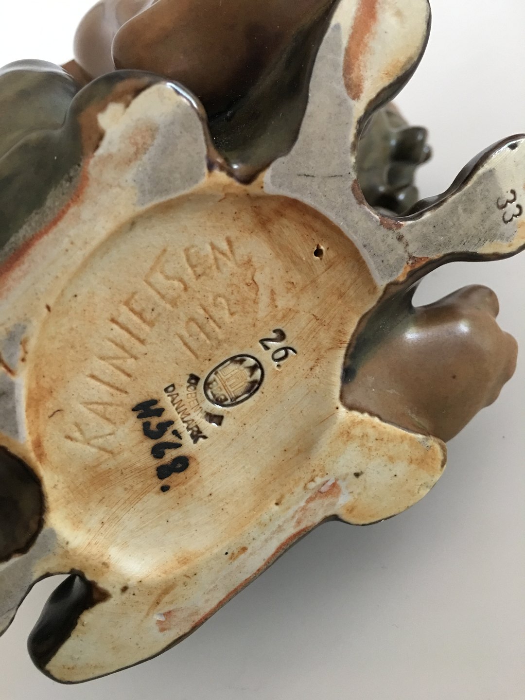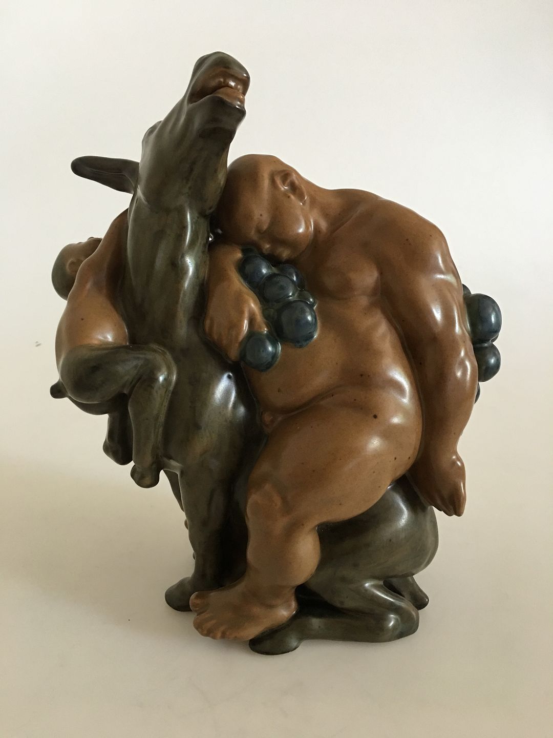 Kai Nielsen Stoneware Figurine no. 26 Sleeping Bacchus and Climbing Faun on a Donkey. 23 cm H (9 1/16"). 18 cm W (7 3/32"). In perfect condition.