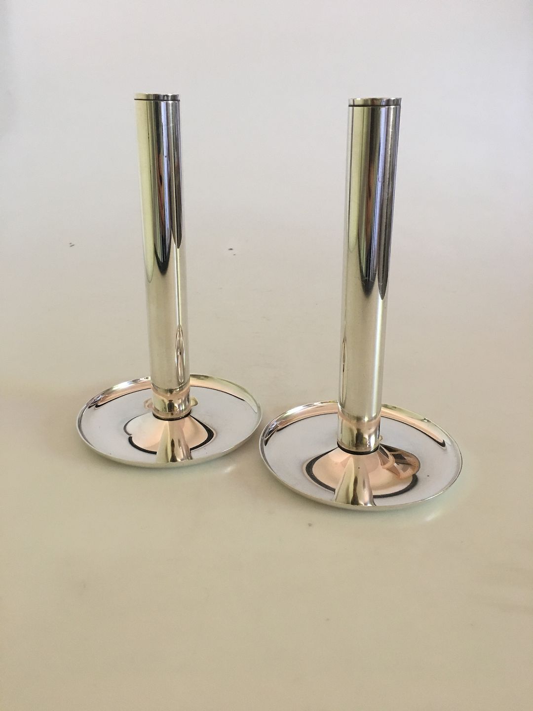 Georg Jensen Sterling Silver Candlesticks No 1138 by Soren Georg Jensen. 19 cm H (7 31/64"). Feet 11 cm dia (4 21/64"). One stick weighs 218 grams / 7.70 oz. In perfect condition.
