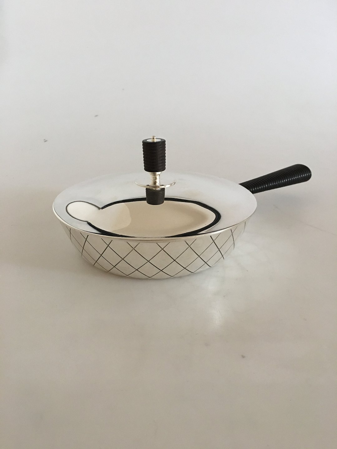 Georg Jensen Skillet in Sterling Silver designed by Sigvard Bernadotte in Art Deco Style. The skillet measures 4 cm high (1 37/64") and has a diameter of 16 cm (6 19/64"). Its total weight is 558 grams or 19.70 oz. The skillet is with Georg Jensen marks from after 1945 and is in beautiful condition.