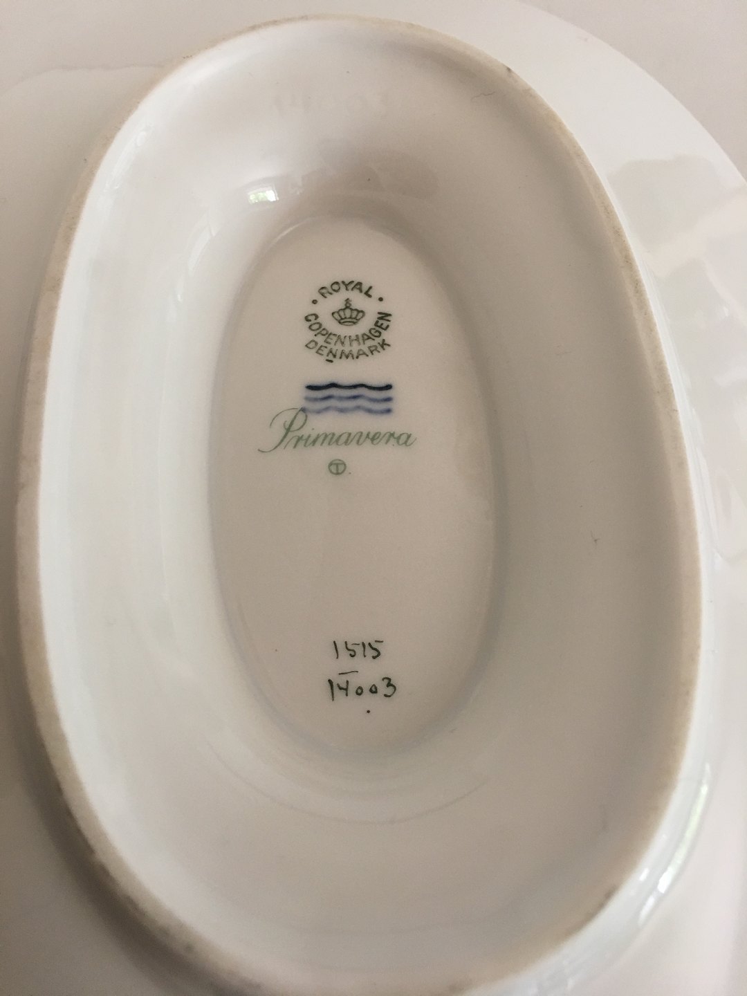 Royal Copenhagen Primavera Thorkild Olsen Sauceskål No 1515/14003. Hvidt stel med blomsterdekoration og guldkant. Skålen er 8 cm H. 18 x 10 cm dia.