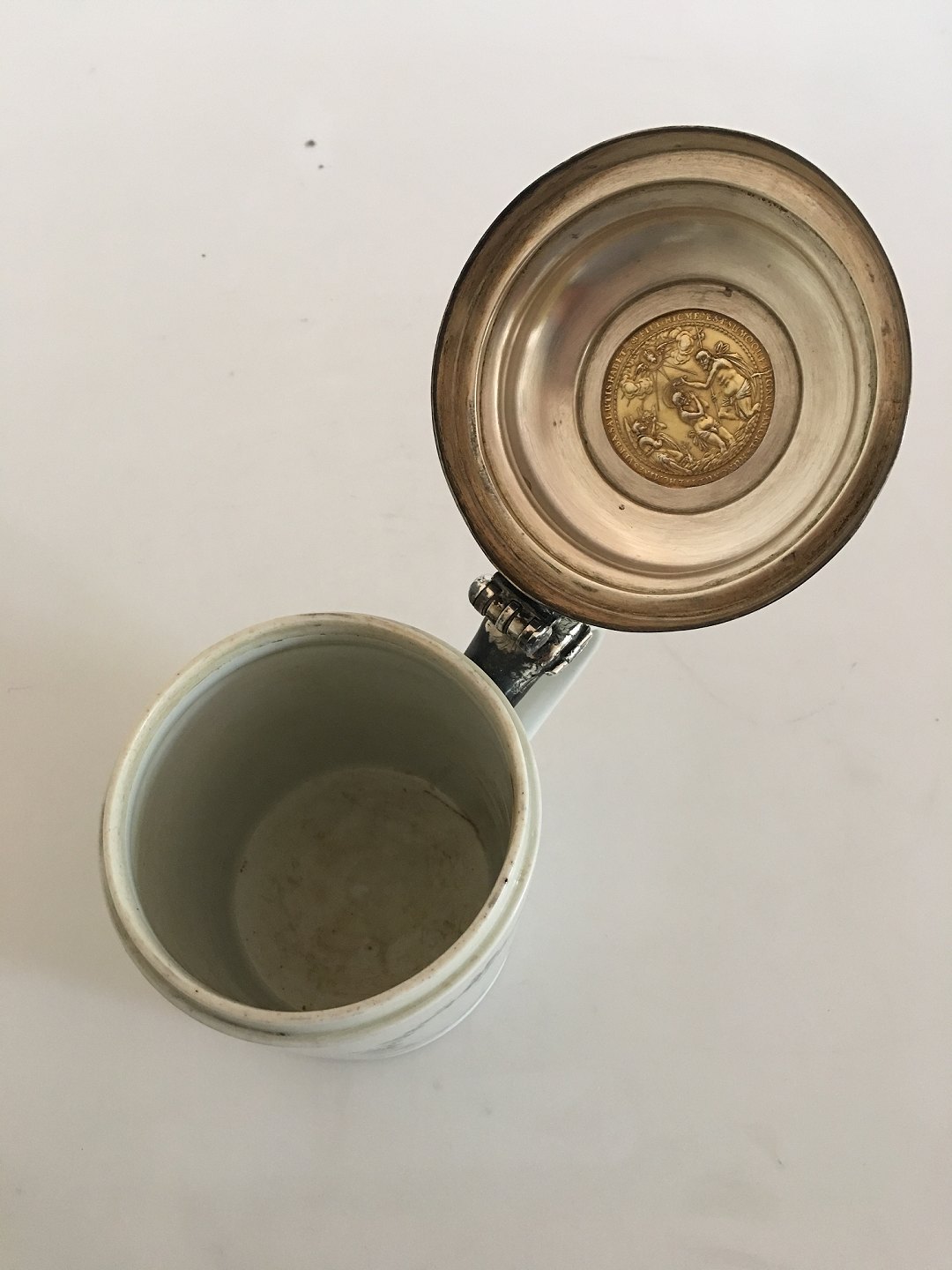 Royal Copenhagen Mug from 1790-1810 with Silver Lid Ornamented with a Religious Motif. Lid is done by Christen Christensen Born 1830, dead 1885. Silversmithy from 2-5-1861. Measures ca. 18.5 cm H (7 9/32"). 12 cm dia (4 23/32")