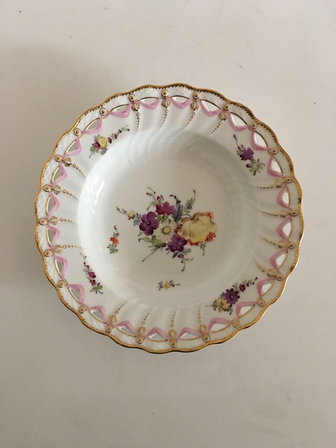Royal Copenhagen Full Saxon Flower Deep Plate with Pierced Lace Border from 1860-1890. 22.5 cm dia (8 55/64"). In nice condition, with No to minimal wear on the gold.