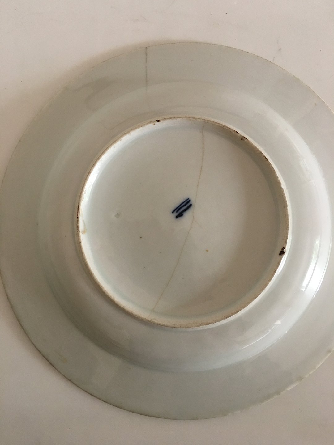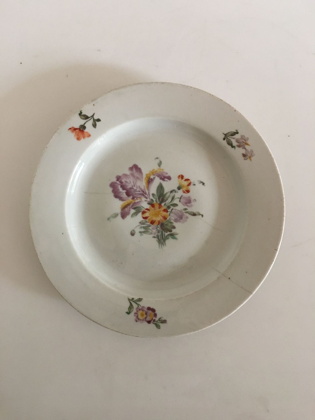 Antique Royal Copenhagen Plate with Flower Decoration 1790-1810. The porcelain is quite worn and tired looking, and most of the flower decoration is worn off. Two sizable hairstrokes across the plate. Measures 24.5 cm