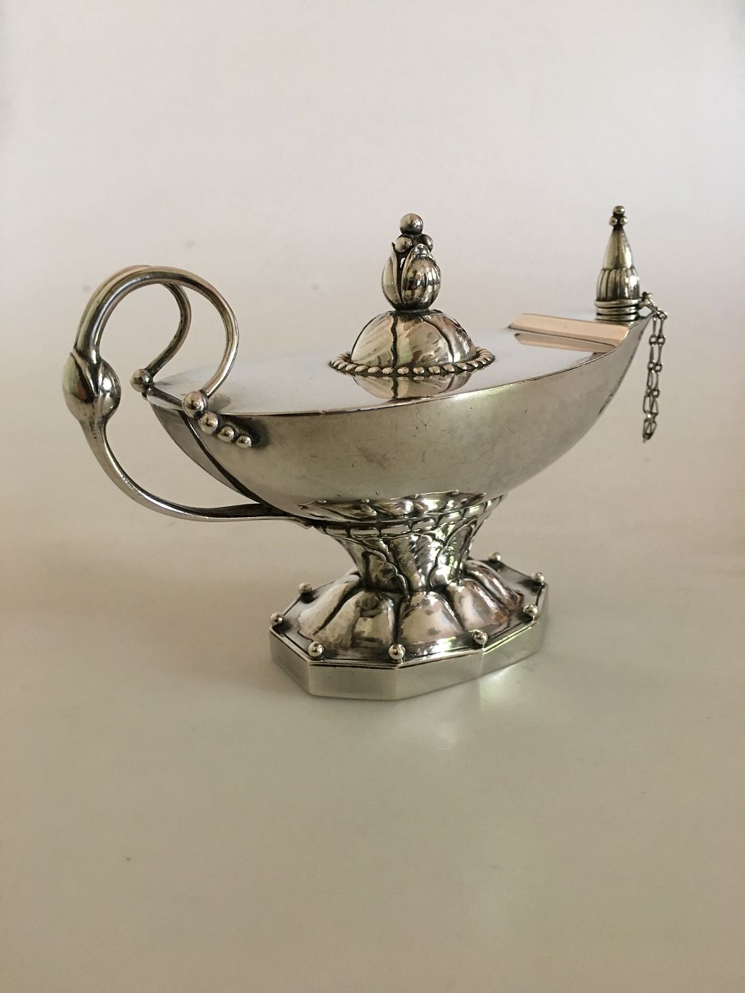 Georg Jensen Sterling Sølv Olielampe No. 12. Lampen er fra 1915-1930. 9 cm Høj, 13.5 cm L. Vejer 168 gram. I fin stand.