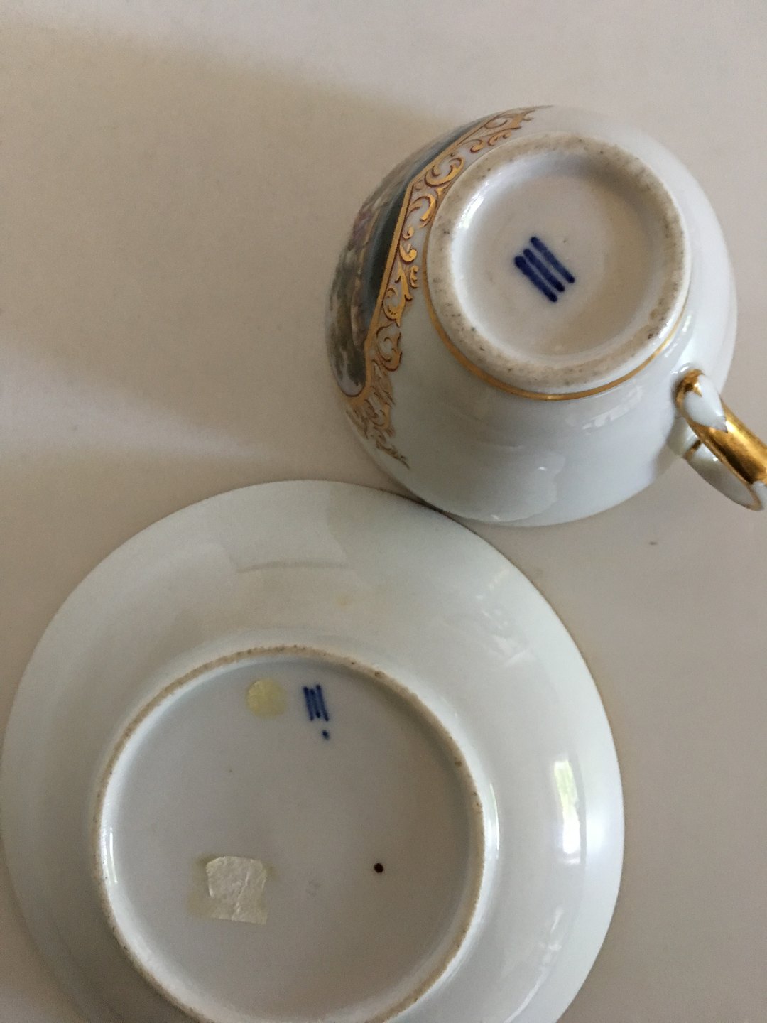 Measures 6,5cm / 2 3/5" high and 8,2cm / 3 1/5" dia. Saucer measures 13,7cm/ 5 2/5".