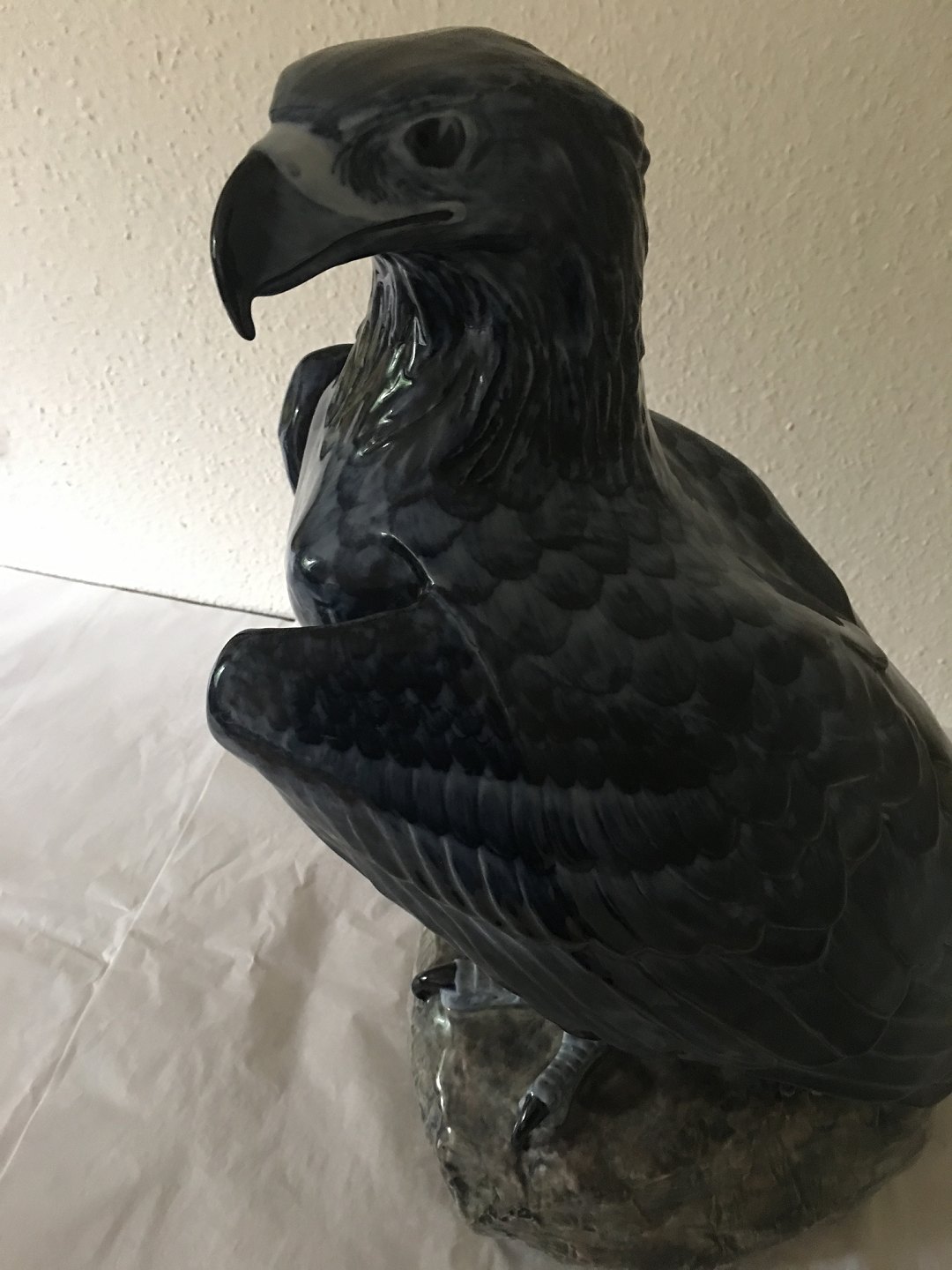 Royal Copenhagen Blå Ørn Vilhelm Th. Fischer 1857-1928. Figur af porcelæn i form af ørn siddende på klippestykke. Fremstillet hos Royal Copenhagen, dessin 123. Sign. Vilhelm Th. Fischer 1919. H. 54 cm. Mærket som 1st sortering og i perfect stand.