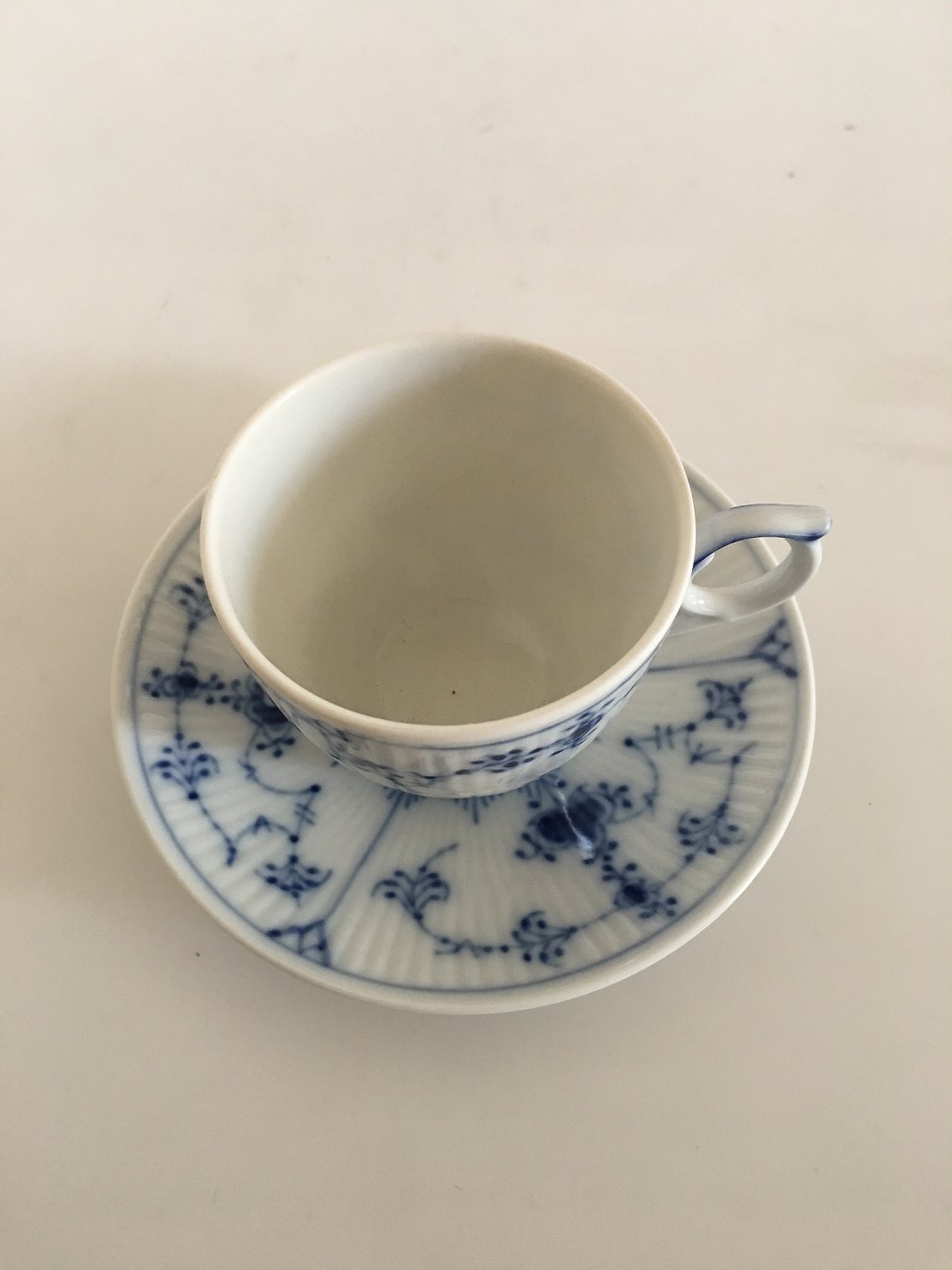 Royal Copenhagen Musselmalet Riflet Mokka Kop med Underkop No. 298. 5.3 cm Høj. 6.4 cm diameter. 1. Sortering.