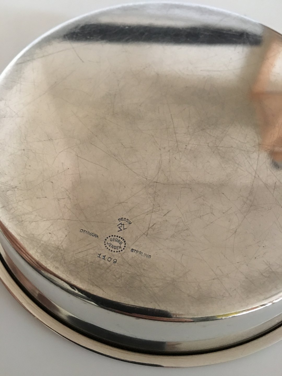 Georg Jensen Sterling Silver Bottle Tray No. 1109 designed by Erik Magnussen. Measures 15 cm diameter. 2.5 cm H. Weighs 197 grams (6.95 oz). Manufactured after 1945.