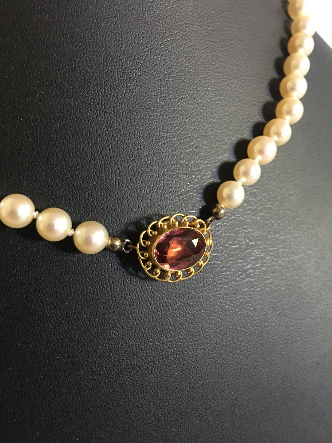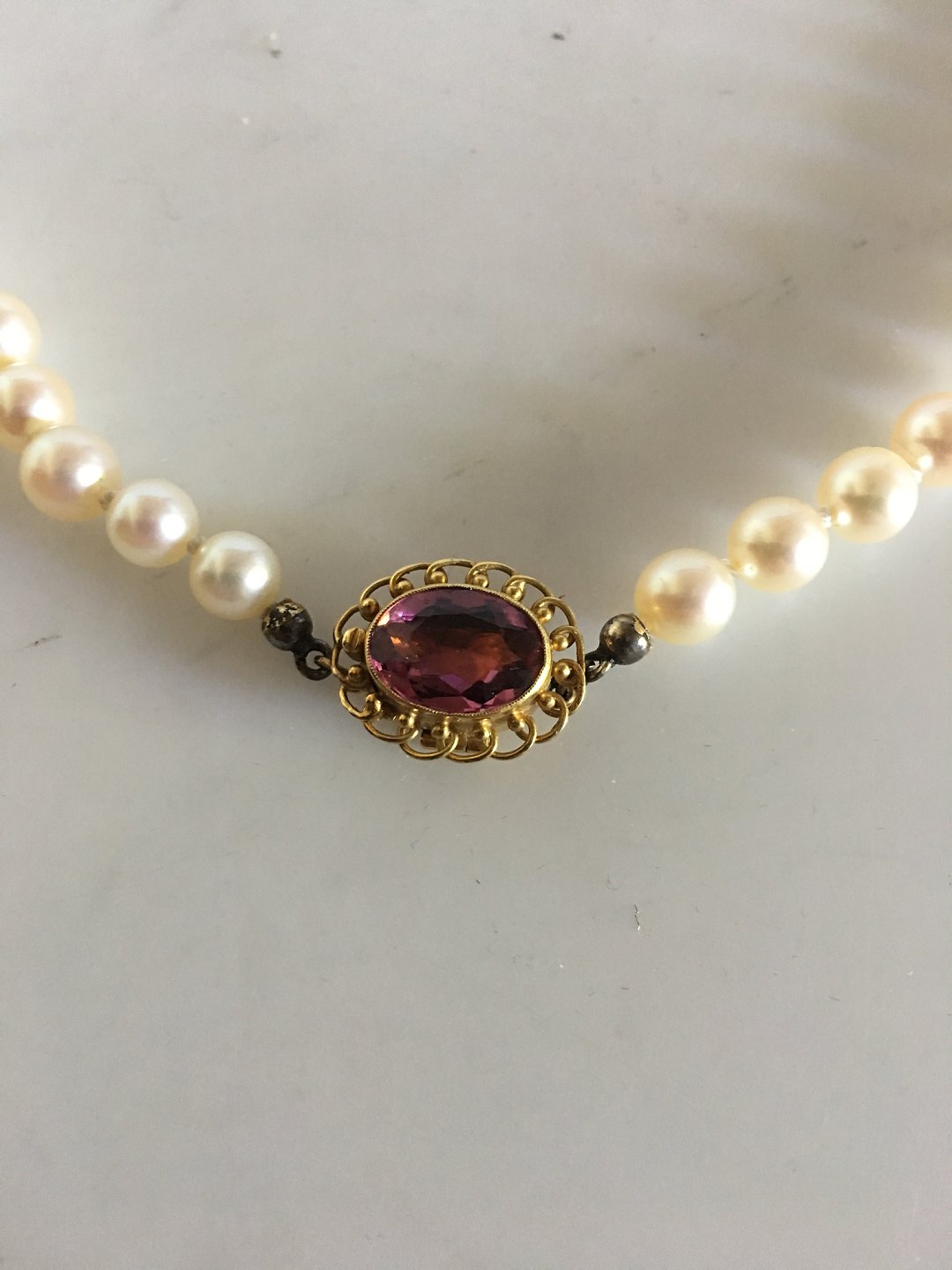Georg Jensen Pearl Necklace with 18K Gold Lock / Jewelry Pendant with Rosa Quartz. The necklace is 42 cm L (16 17/32") and consists of 56 graduated cultured pearls similar in size ranging between 4 and 5 mm. The necklace is manufactured after 1945.
