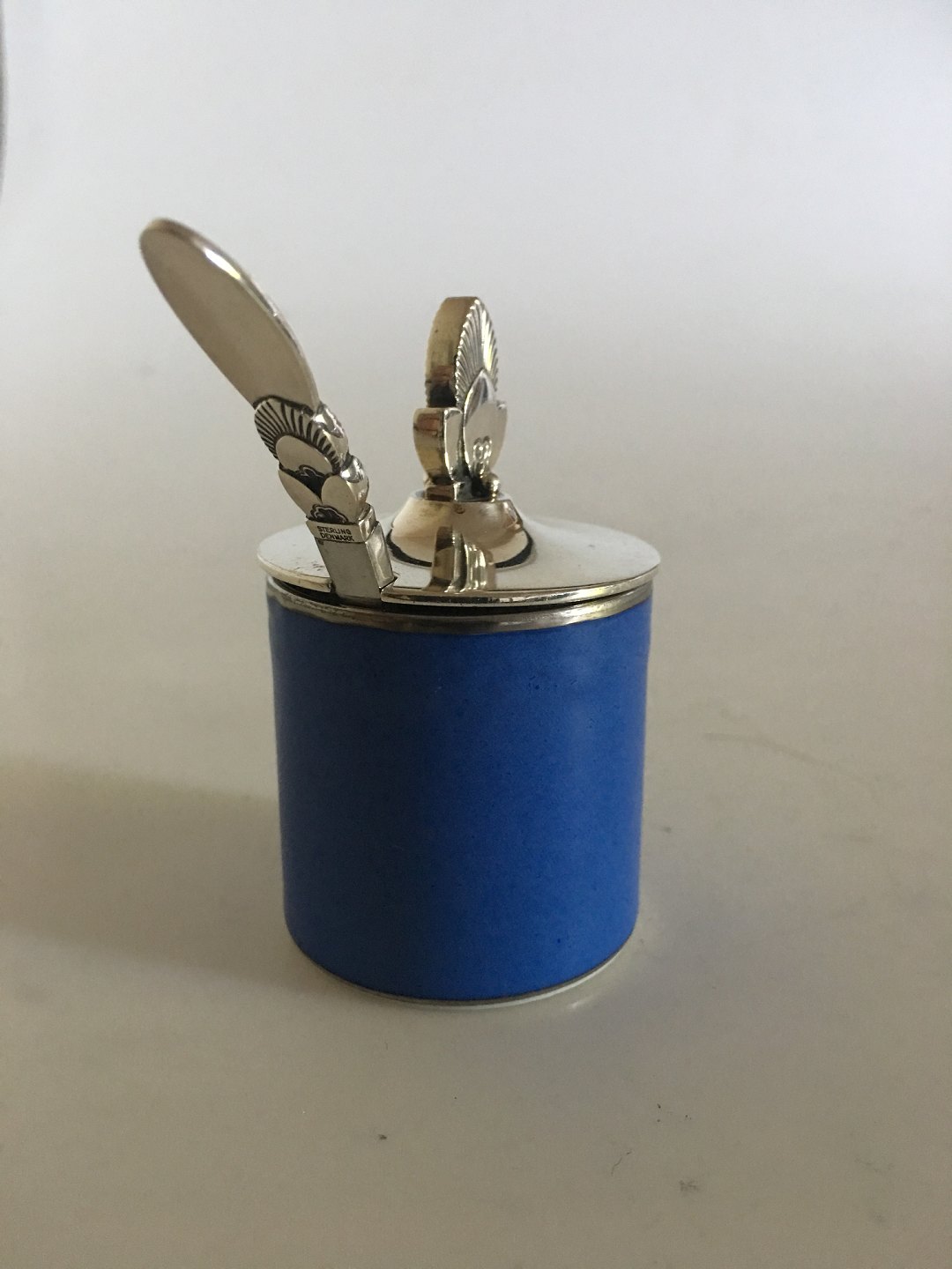 Georg Jensen / Royal Copenhagen Mustard Jar No. 8073 with Cactus Lid No. 815C and Cactus Mustard Spoon. Jar measures 4.5 cm H. Lid measures 4.5 cm diameter. Combined weight of lid and spoon is 37 grams. Manufactured after 1945.
