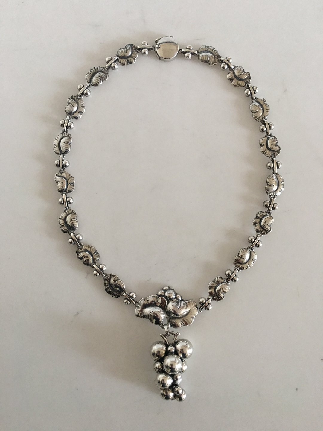 Georg Jensen Sterling Silver Necklace No. 96 with Grape Pendant Pieces. Measures 48 cm L. The pendant piece measures 6.8 cm L. Weighs 95 grams. Manufactured after 1945.