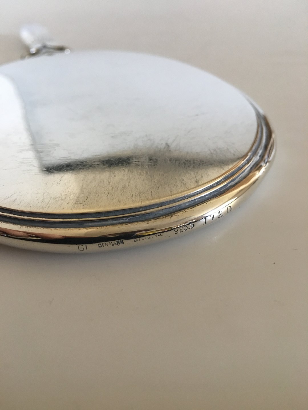 Georg Jensen Sterling Silver Hand Mirror No. 172 D. Measures 29 cm L (11 27/64"). 11.5 cm diameter (4 17/32"). Weighs 406 grams. In good condition. The glass i a but loose.